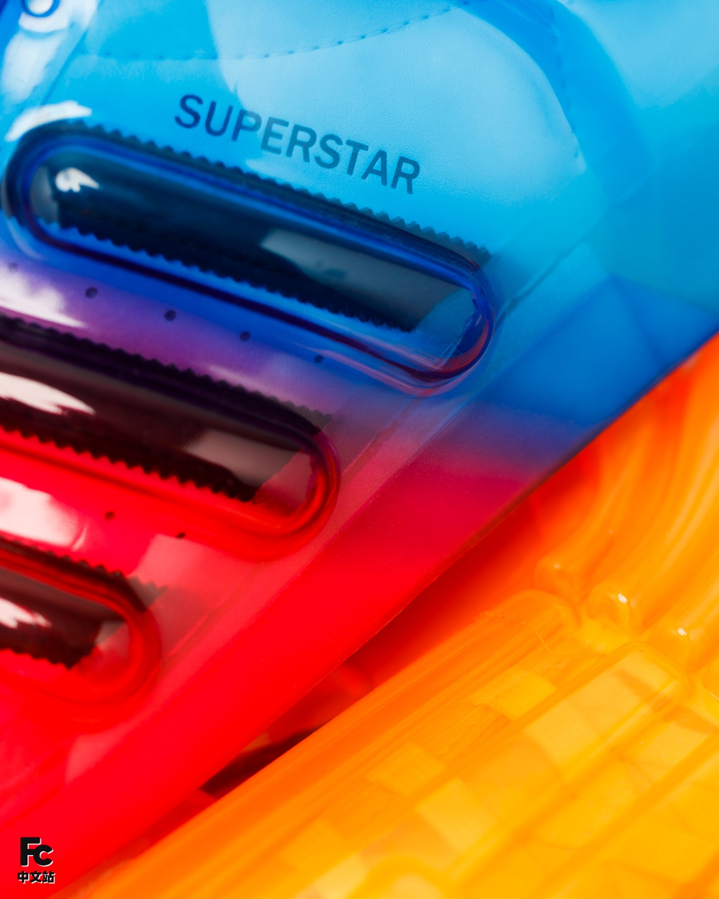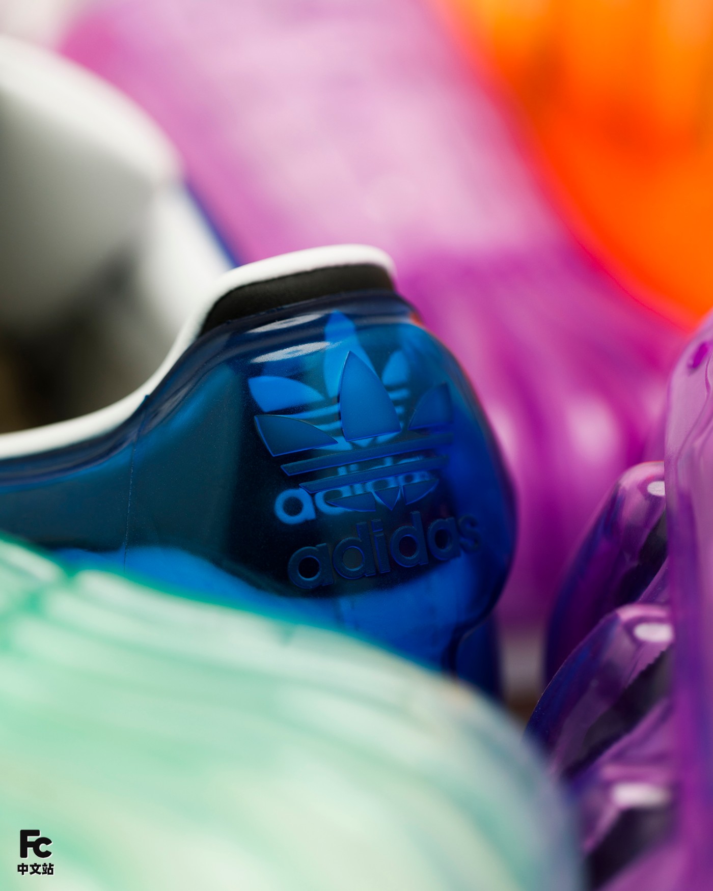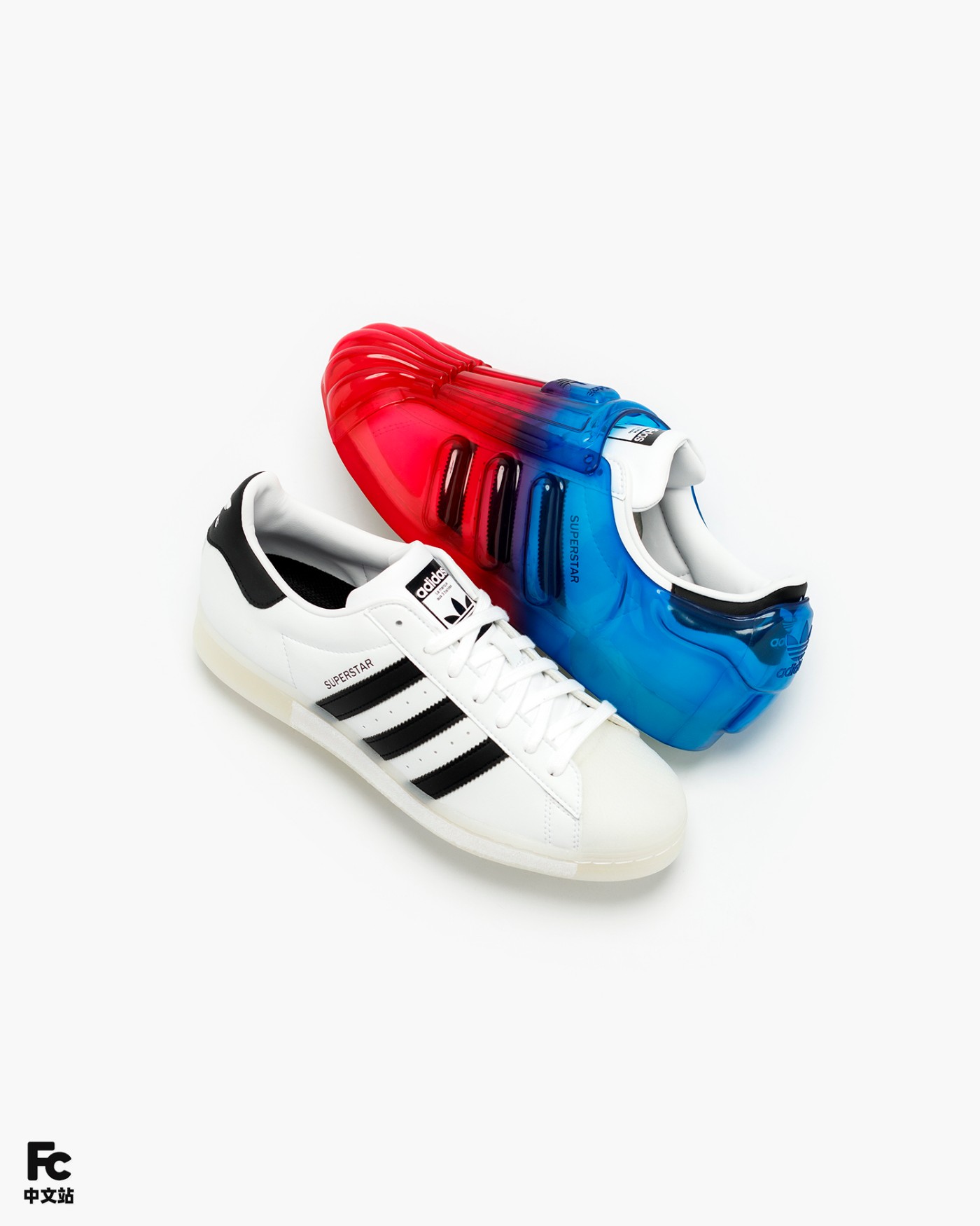 首先最有意思的就是基于 OG 款 Superstar 为核心,通过追加半透明果冻彩色外壳的形式,带来前所未见的新颖造型。