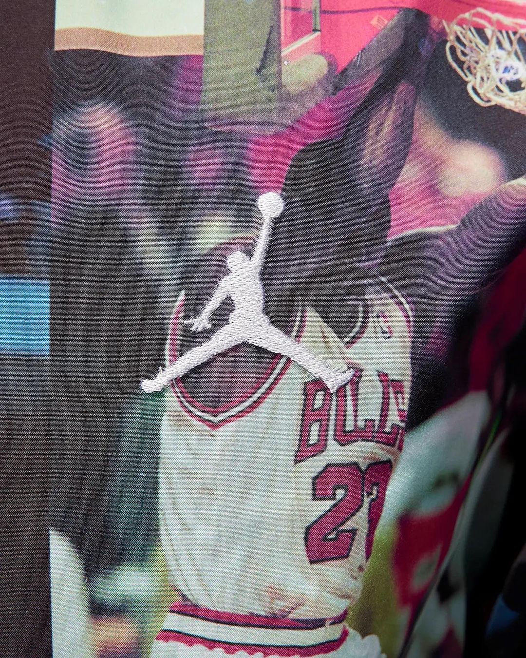 服装整体造型以黑色为主调,乍看花哨的图案,实则是乔丹赛场各式各样的「名场面」瞬间。