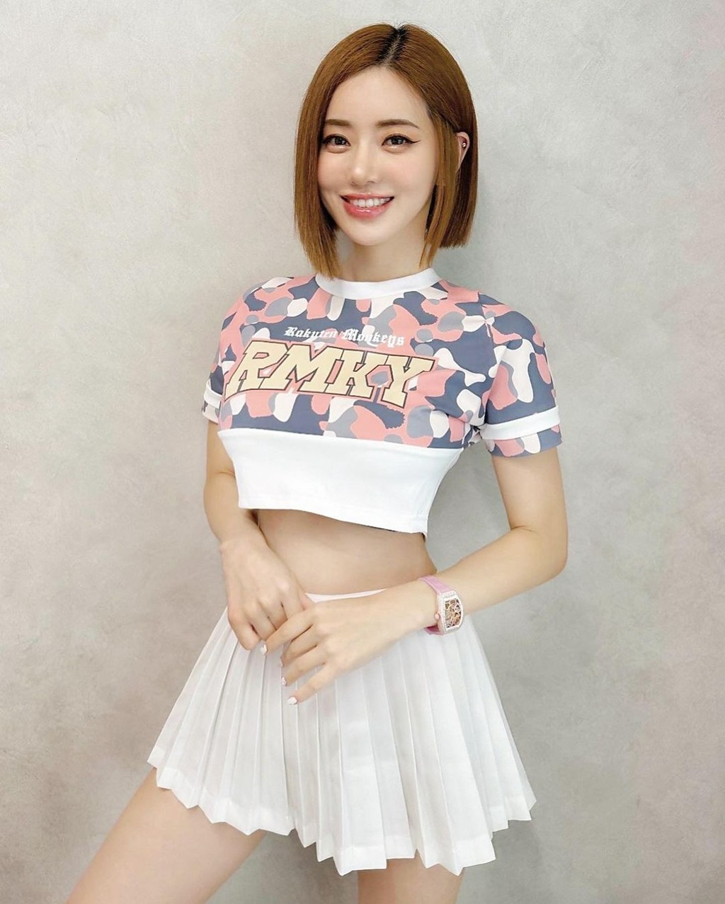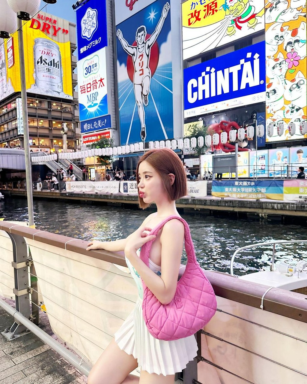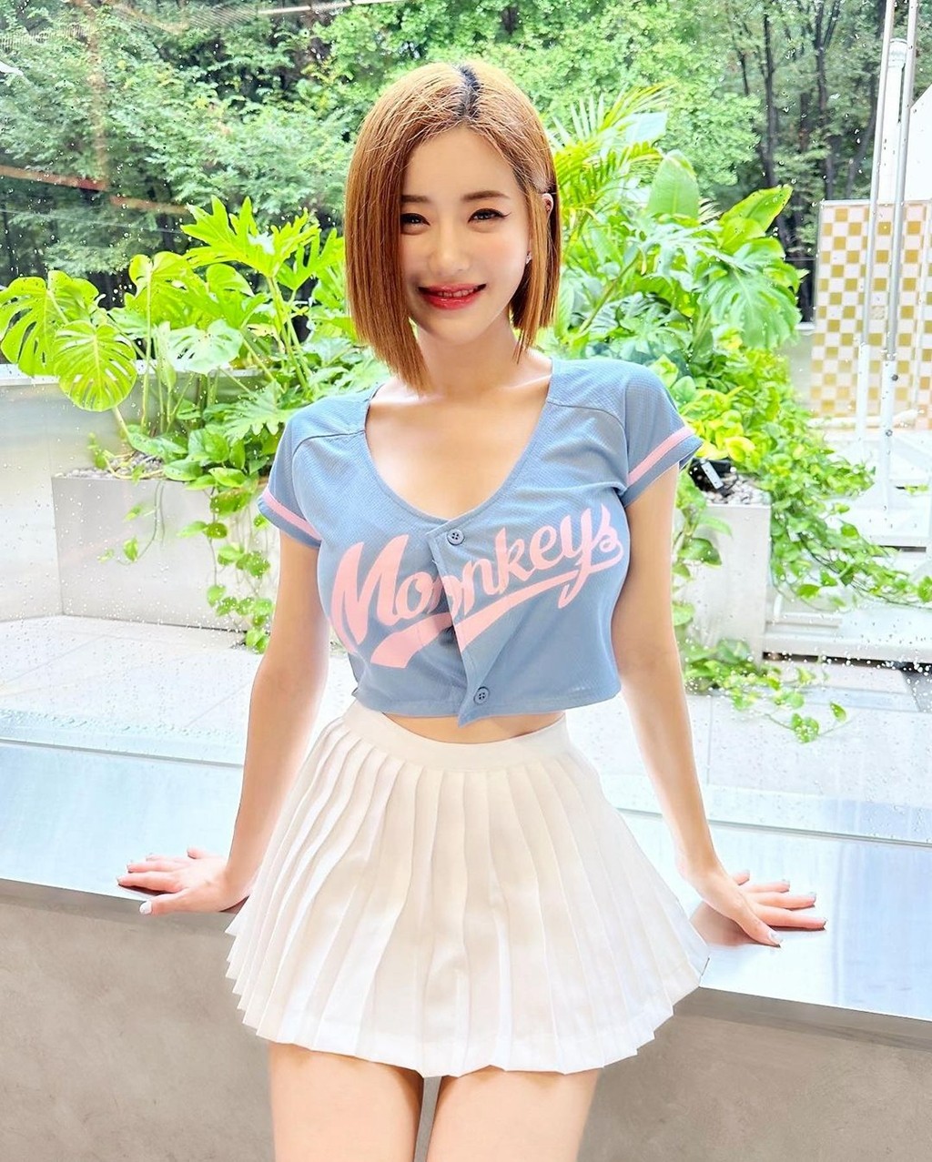 先是晒出一组美图,JK 百褶裙搭配紧身小上衣,扣子都快崩开了!