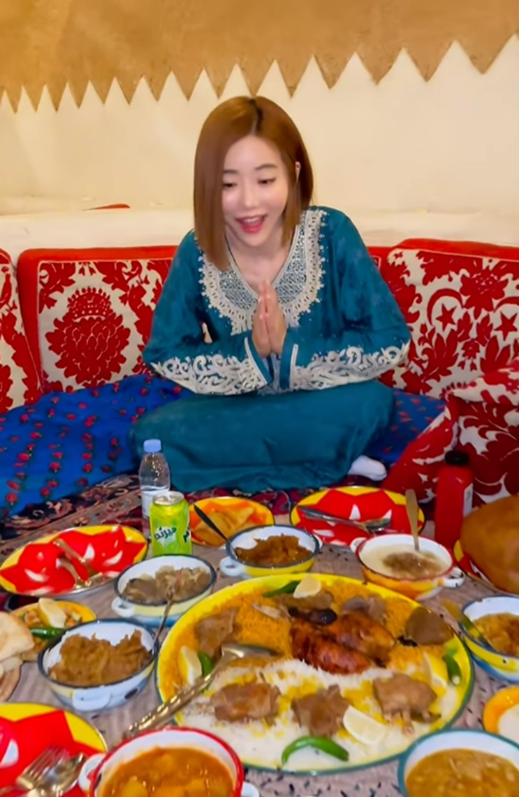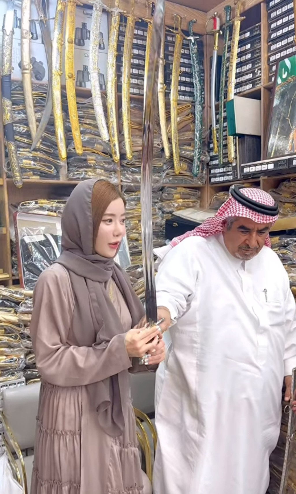 她被邀请到当地的特产店,拿着阿拉伯刀就是一顿耍,也不知道开没开刃,反正看着挺危险。