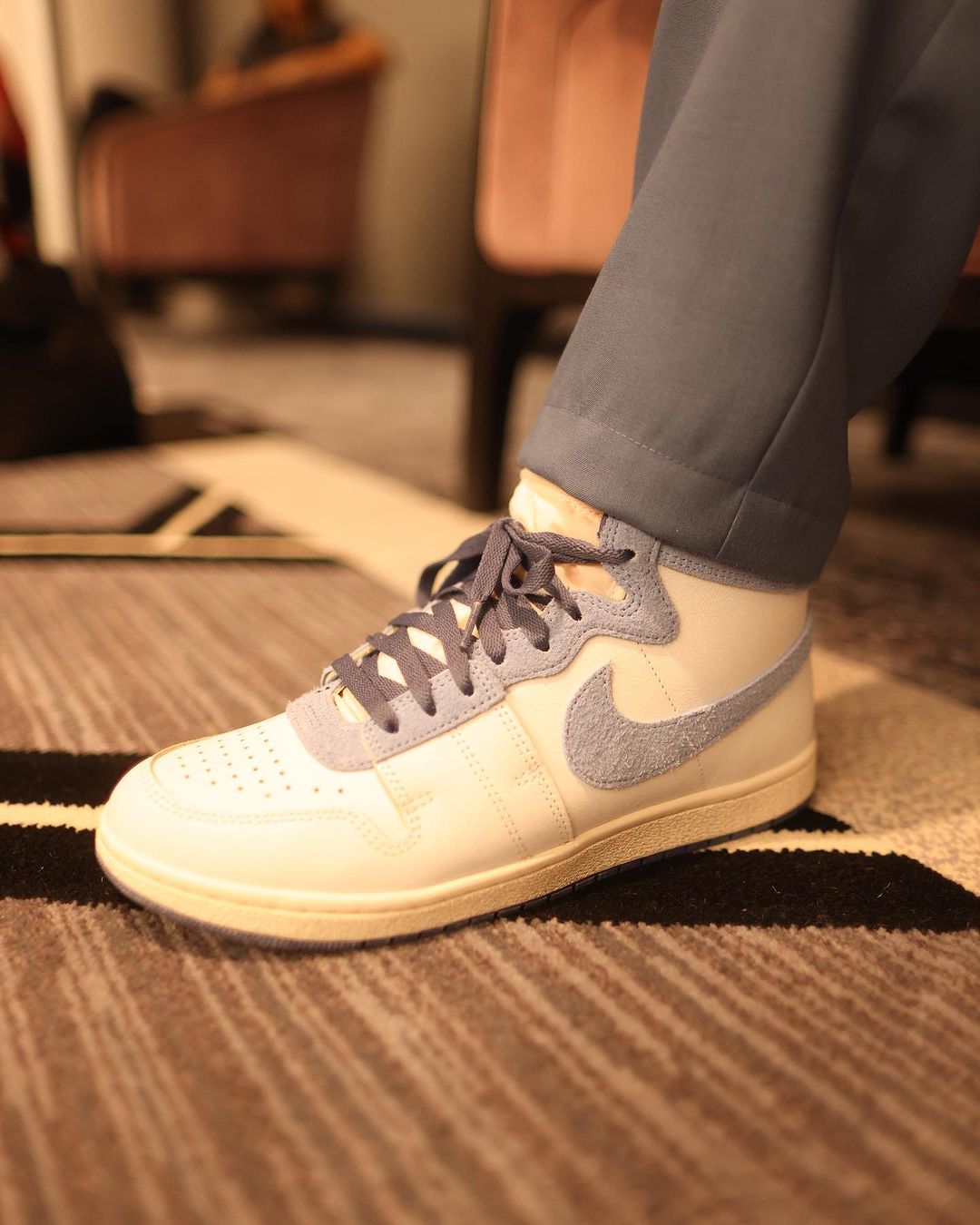 北卡配色球鞋,外加一套蓝色休闲装,鞋王今天这身造型主打一个小清新。