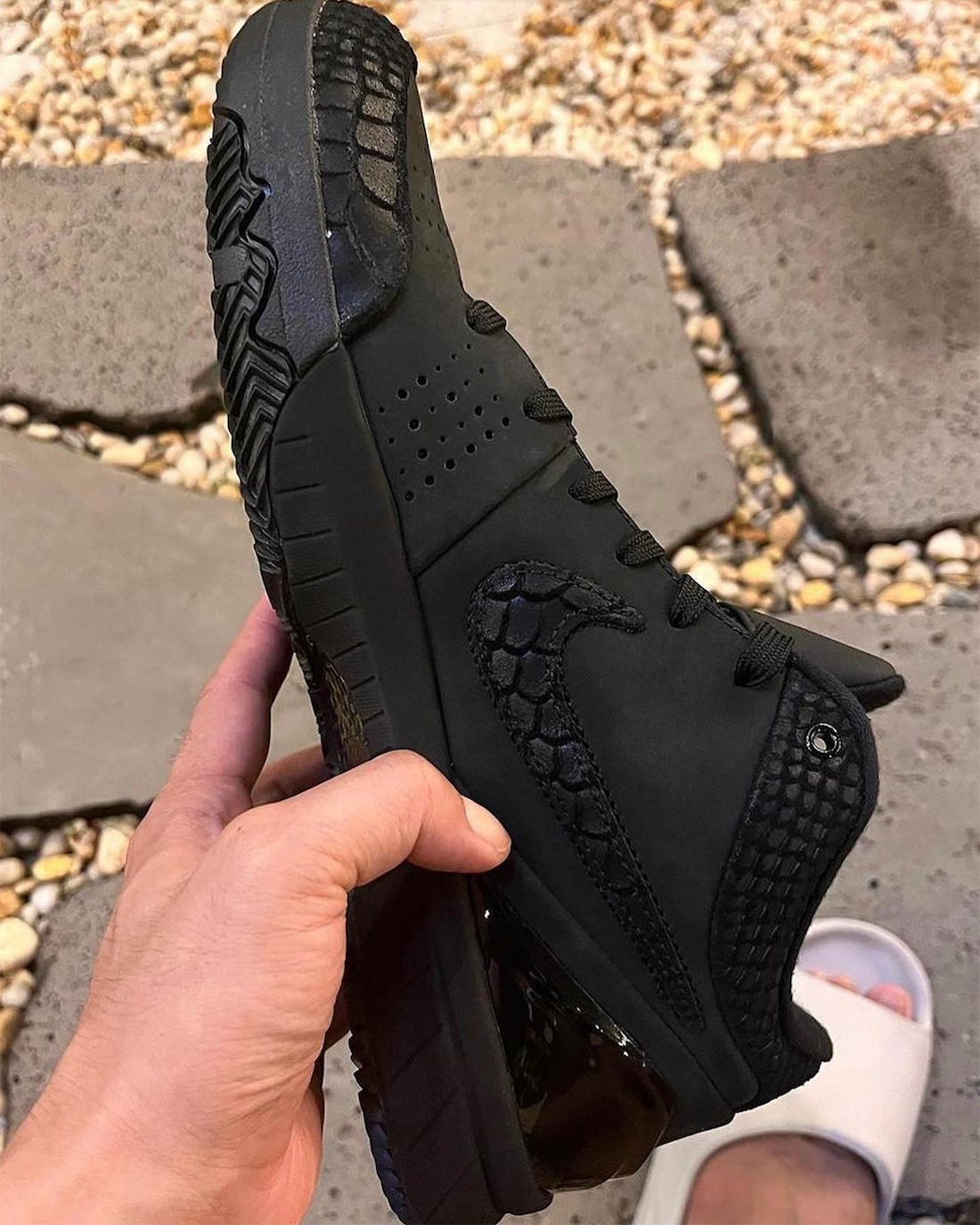 整体采用黑色以及深灰色覆盖鞋身,框架以黑色蛇纹皮革材质打造,看起来似乎与此前复刻的「蛇纹」Nike Kobe 4 Protro 类似。