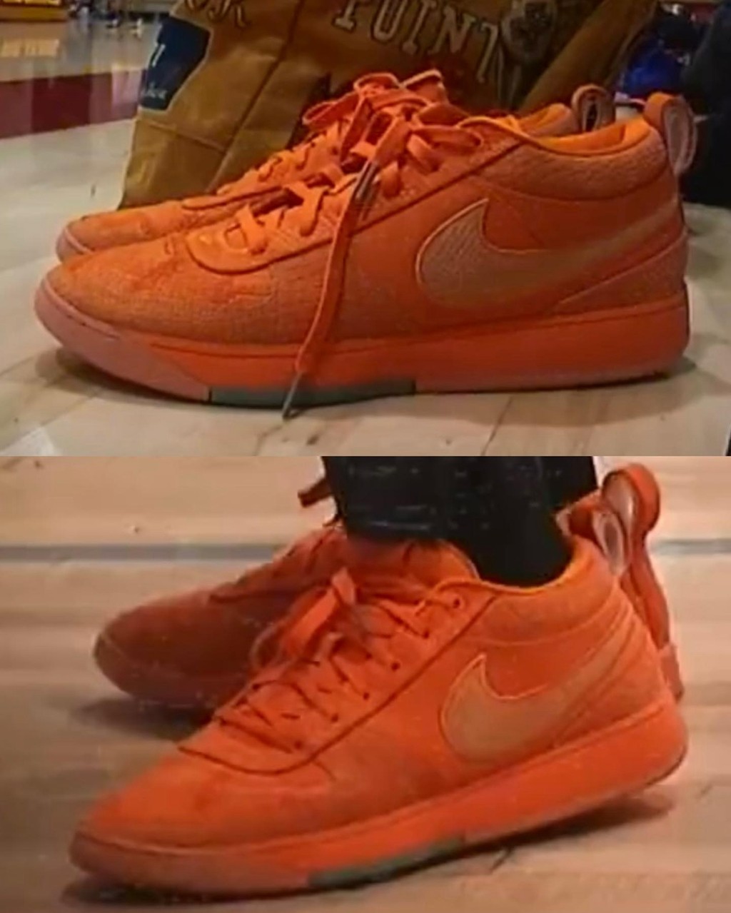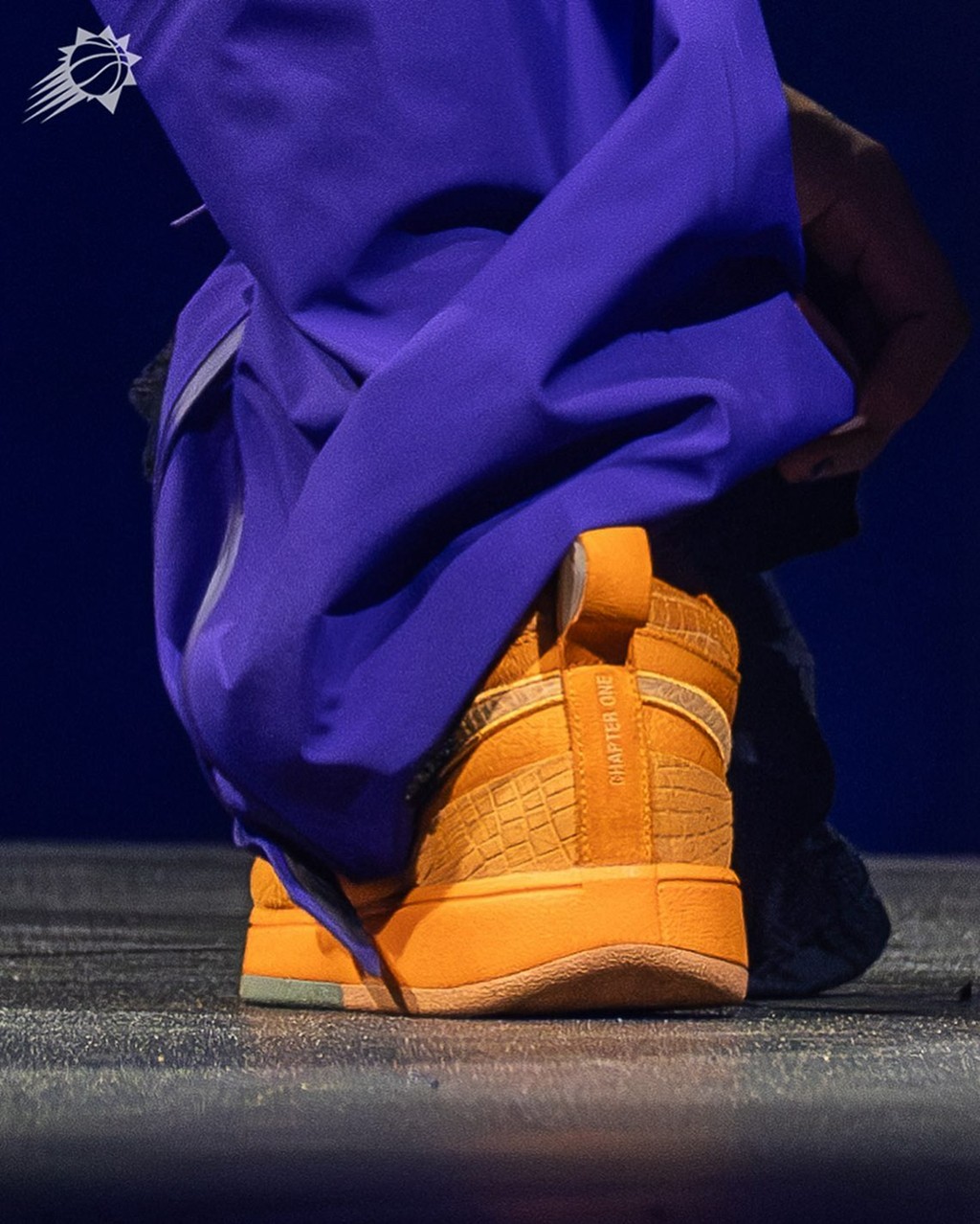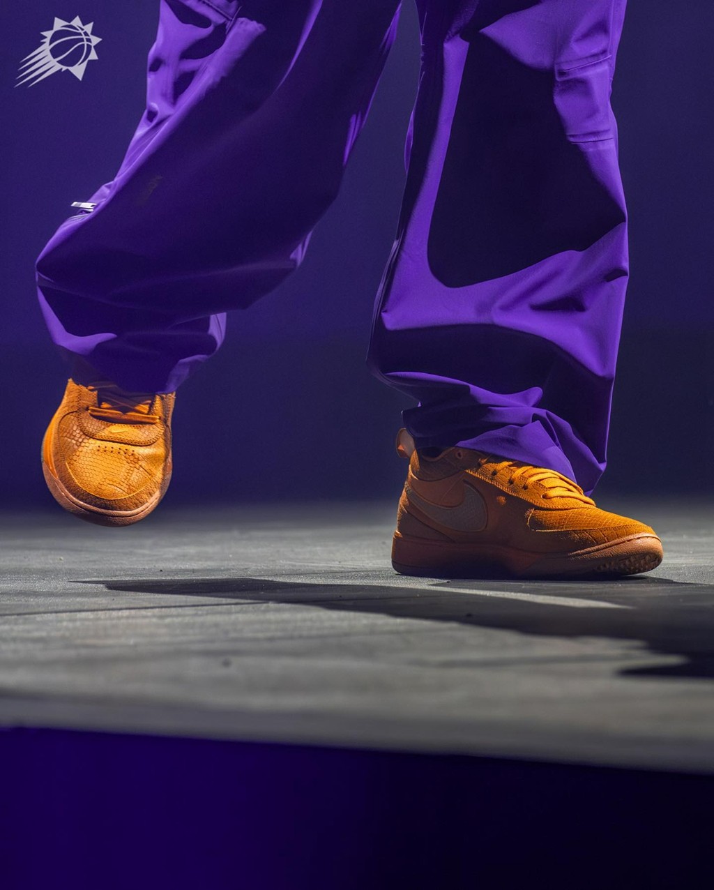 只见 Drake 一身紫色服饰,搭配橙色的 Book 1,向菲尼克斯太阳队的经典配色致敬。