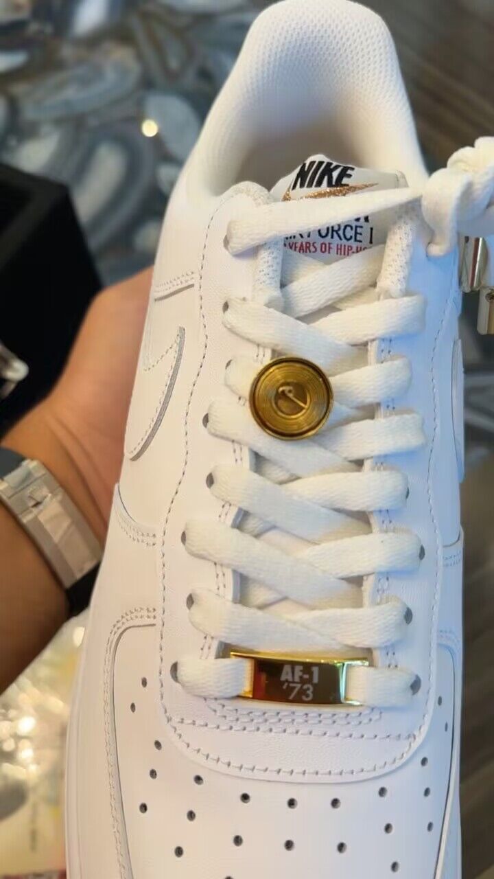 鞋面处带有金色圆形和 AF-1 73 字样挂饰,虽然没有太多装饰,但奢侈感十足。