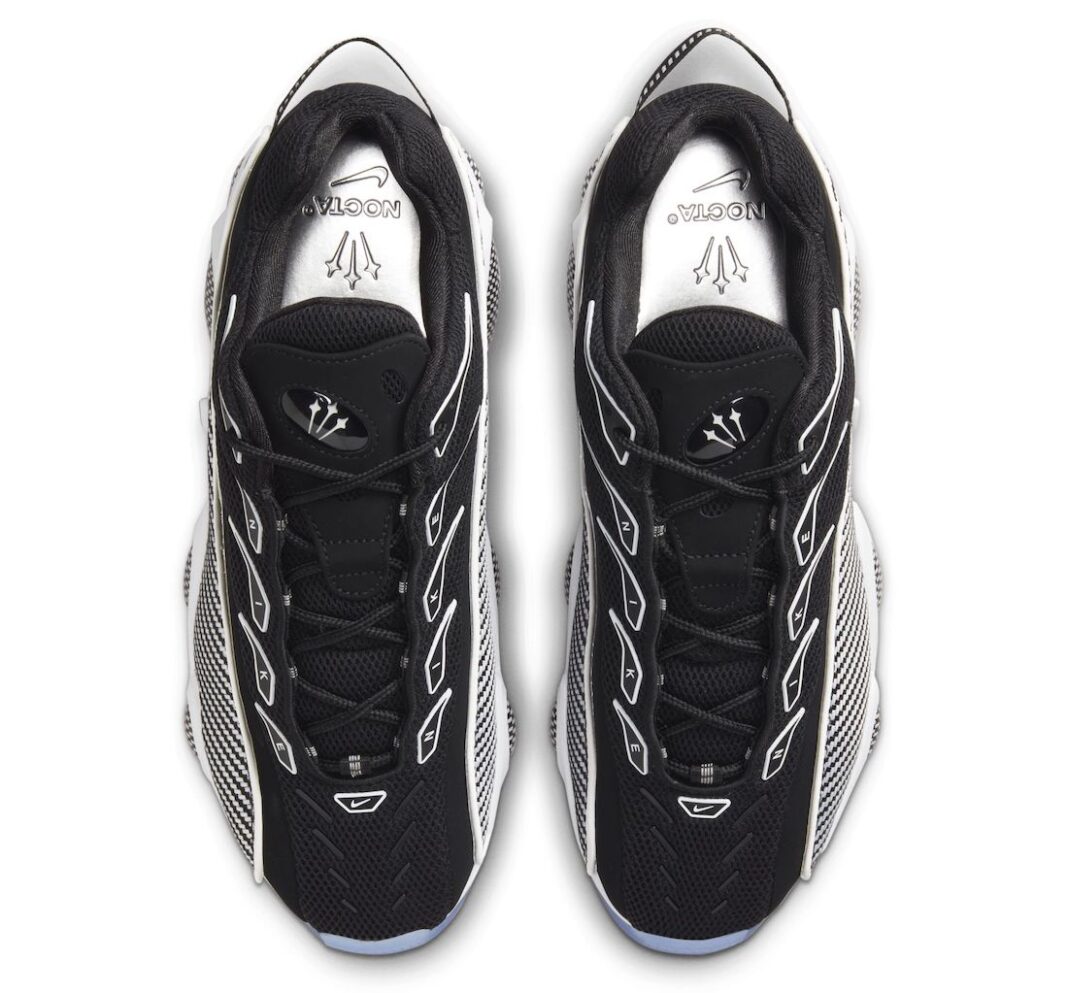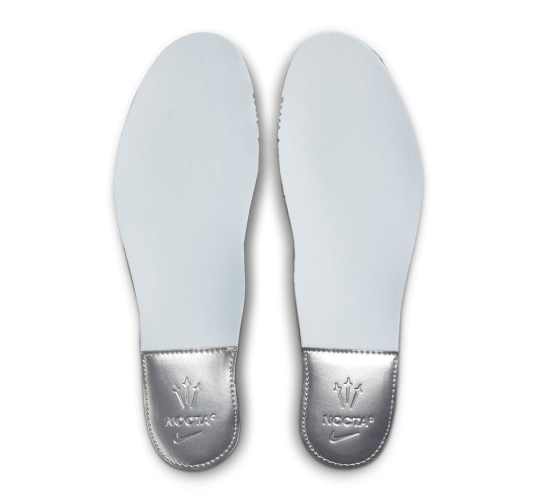 从上到下分别是三剑 Logo、NOCTA 字样、Nike Swoosh,展现高规格联名身份。