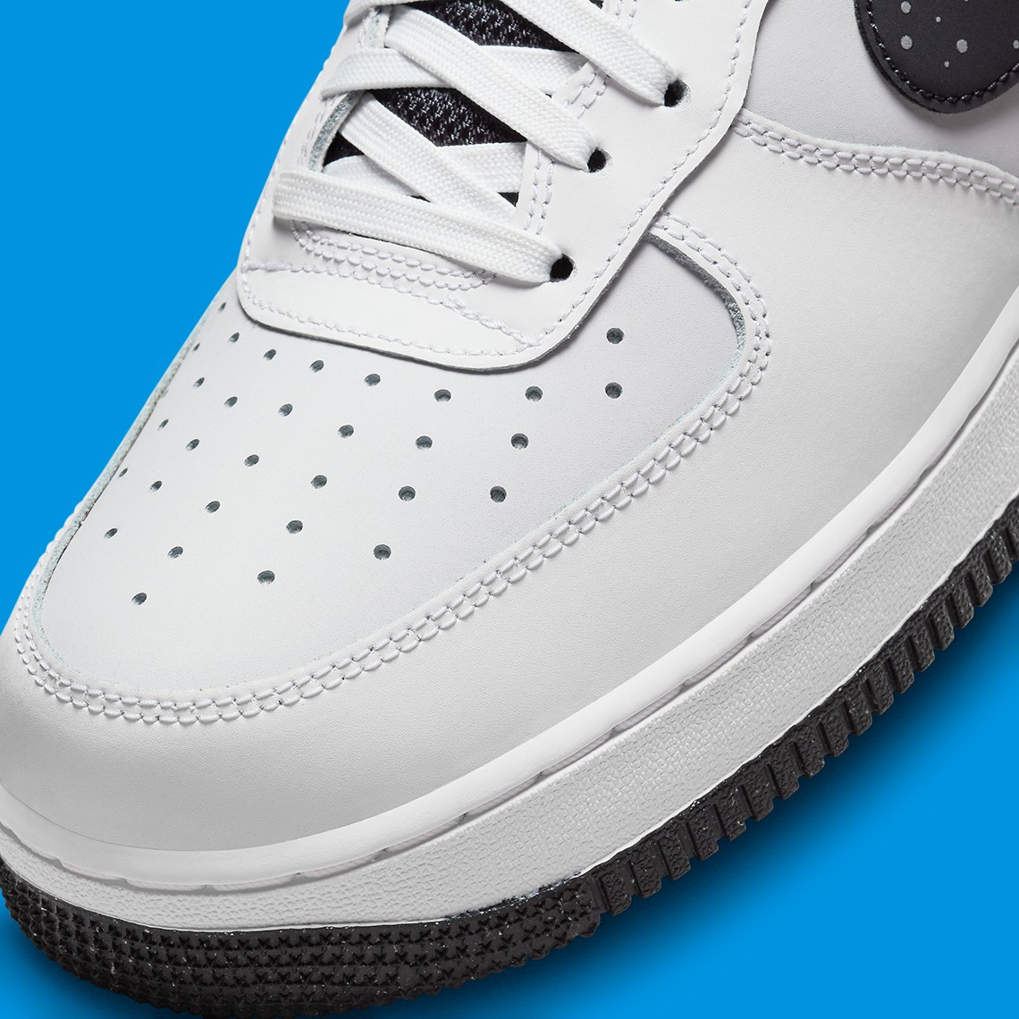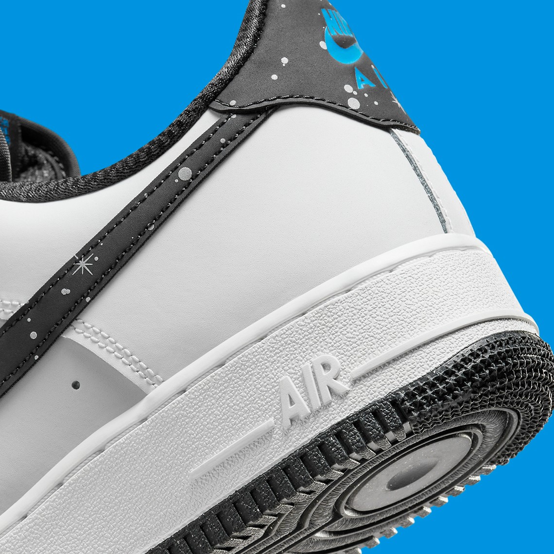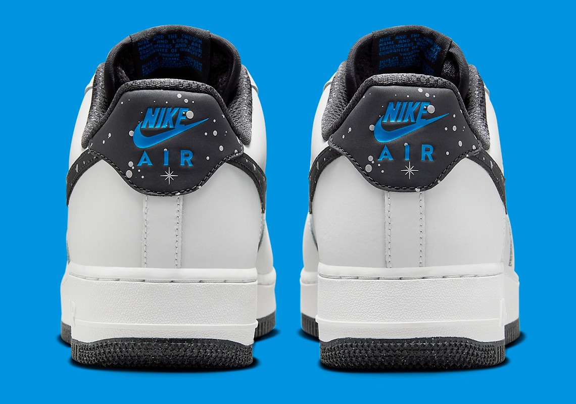 整双鞋采用纯白配色覆面,黑色 Swoosh 上印有泼墨和白色星星点缀,低调的同时还有一些俏皮。