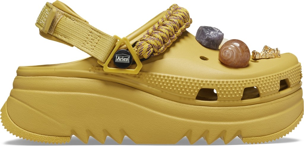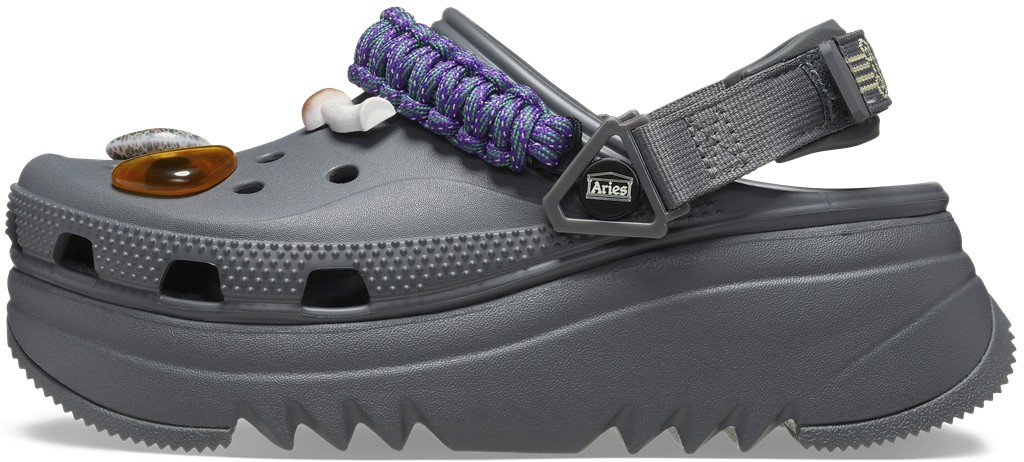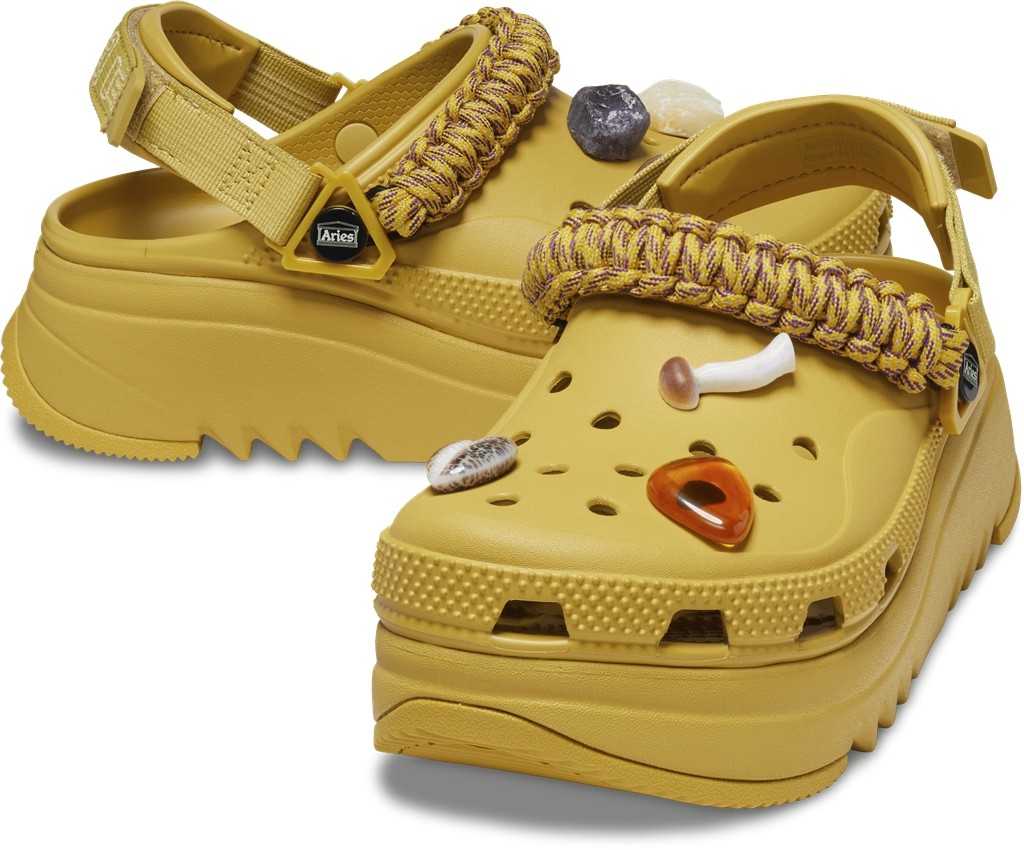 此次选用 Crocs Hiker Xscape Clog 猎户鞋型作为设计蓝本,注入 Aries 标志性的设计风格。