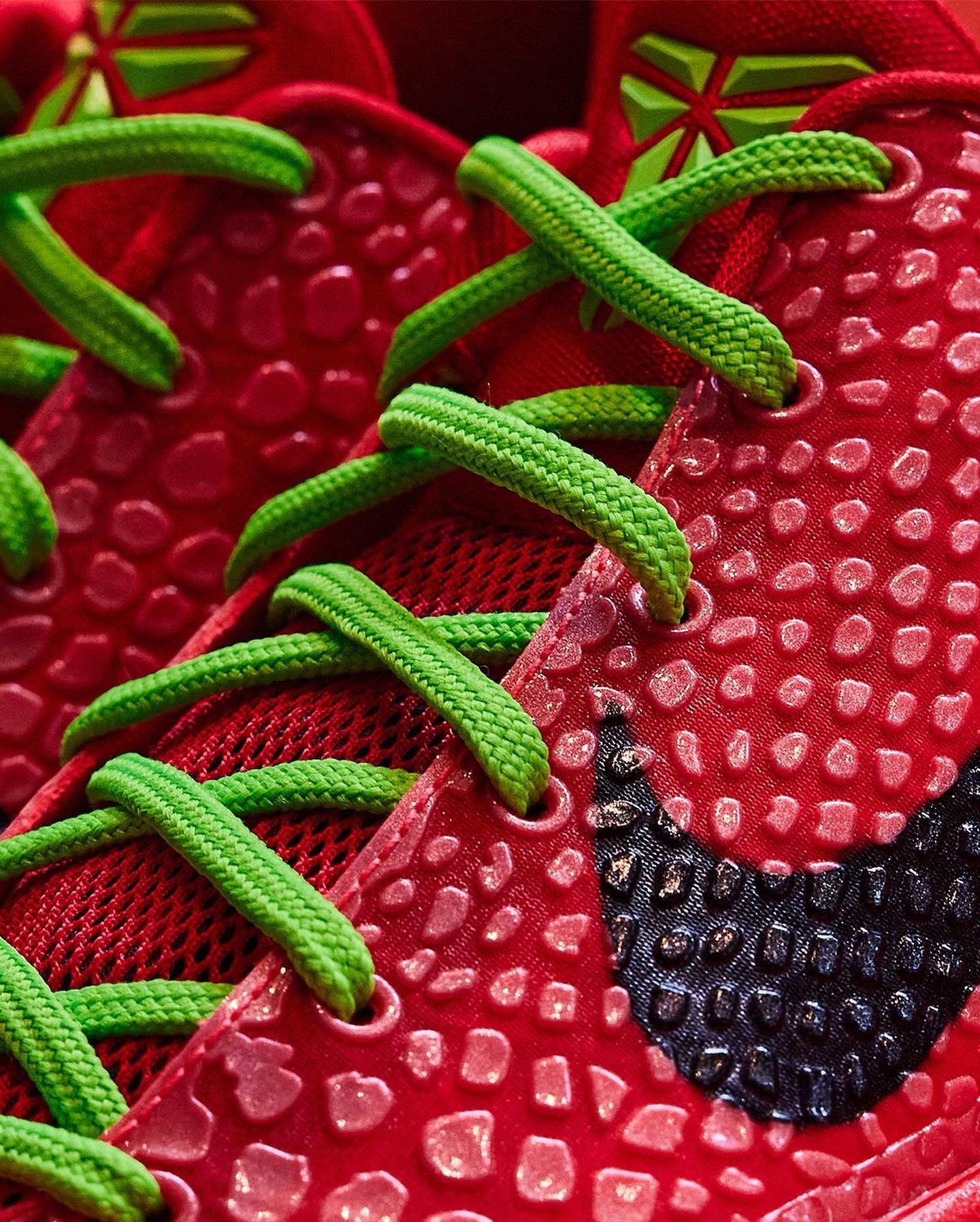 有关于鞋款的细节,相信大家都不陌生了,大红色的鞋身装扮整体,点缀绿色细节。