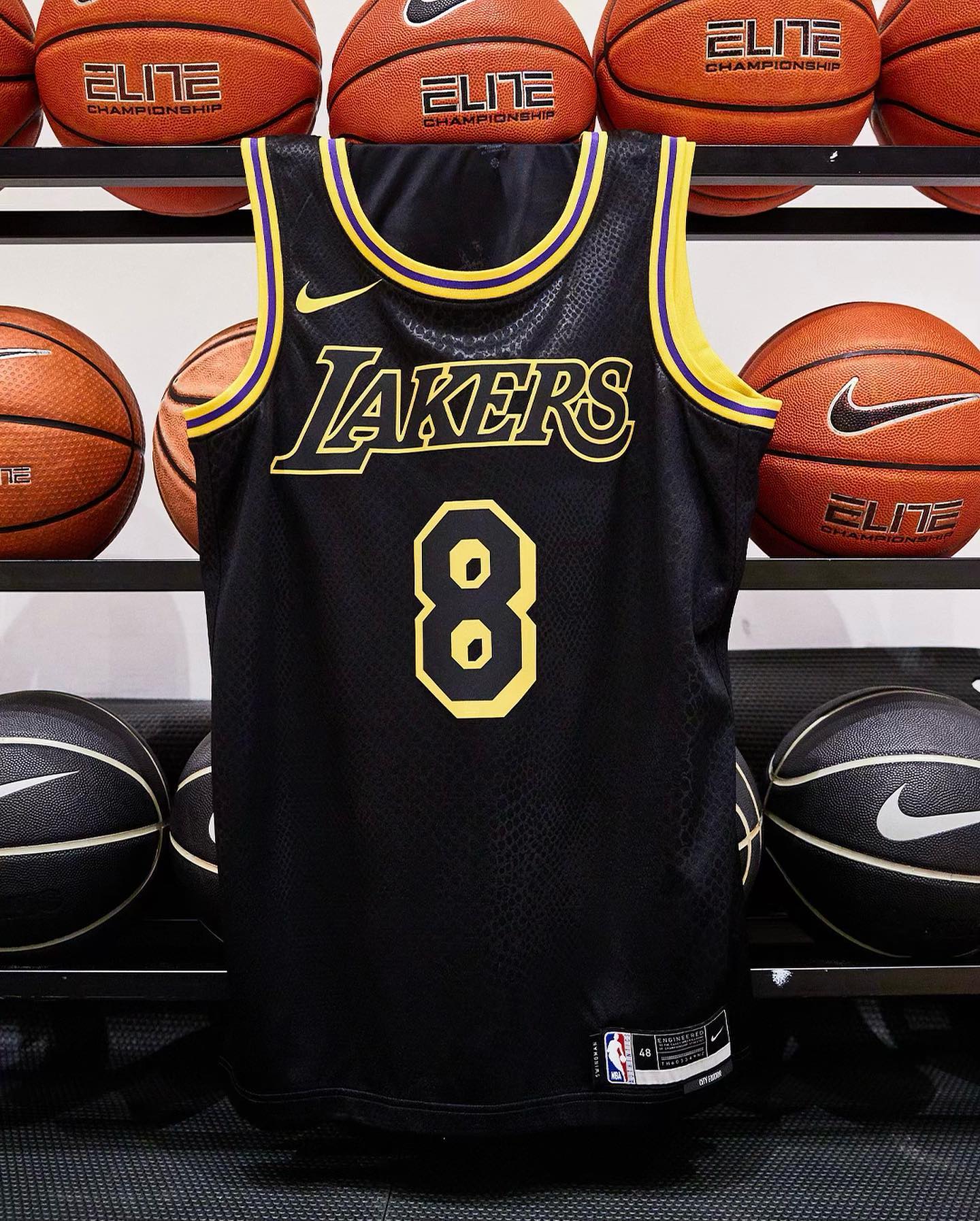 而在全新的球衣上,蛇纹暗纹布满整件球衣,金色的勾边点缀相当应景,正面 8 号不出意外背号为 24。
