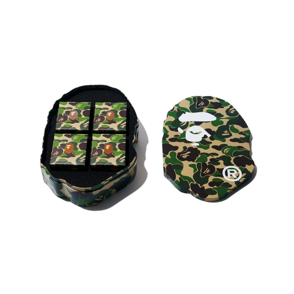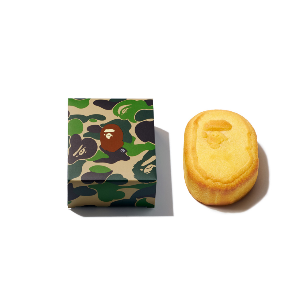 这次是猿人头轮廓的铁盒造型,覆盖 BAPE® ABC 绿色迷彩印花,内含 4 枚独立包装的奶黄流心月饼。