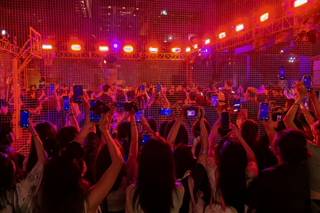派对开始后,嘉宾们汇集于上海静安嘉里中心露天广场,以篮球场为背景的现场布满流动多彩的霓虹灯光。