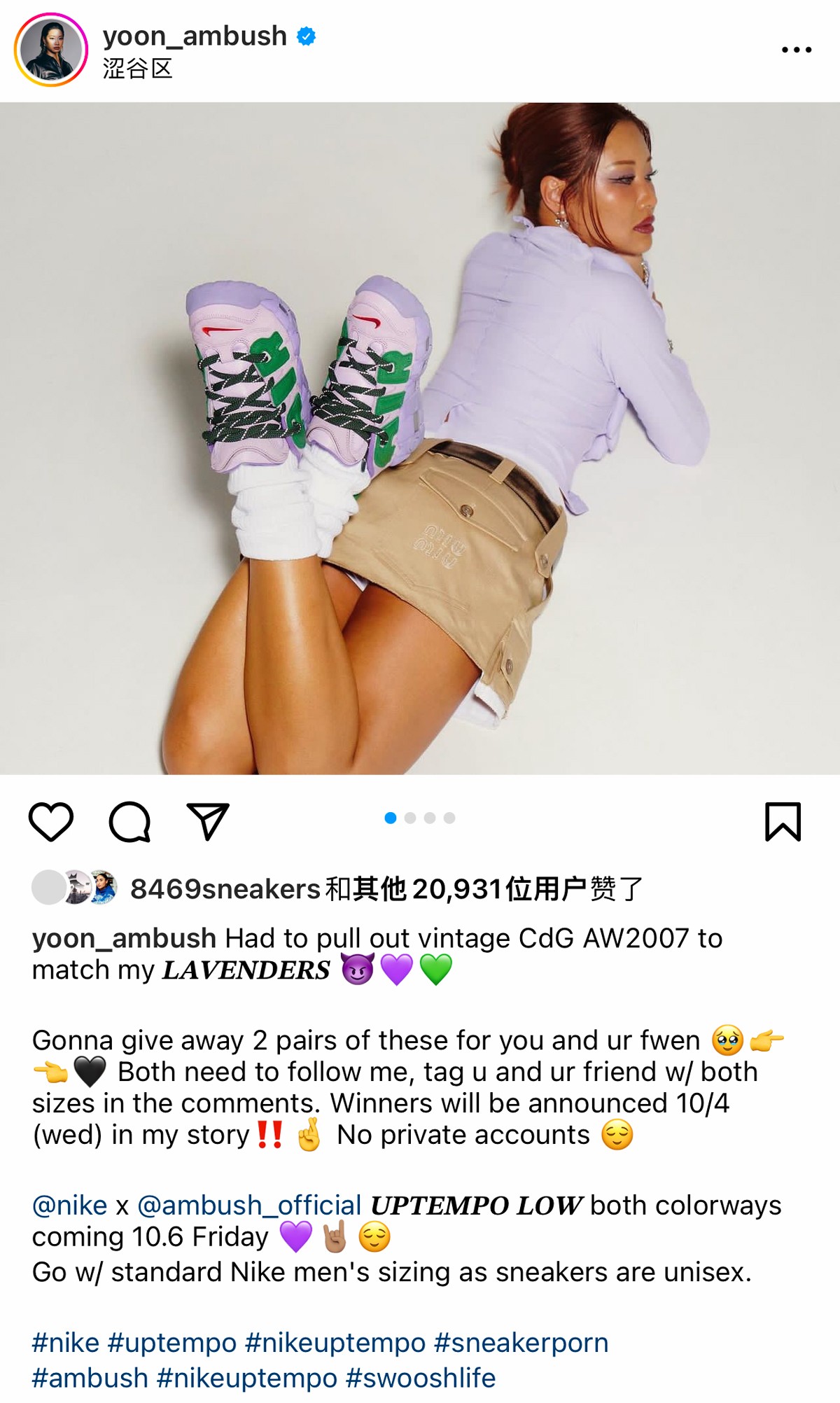 甚至还在社交媒体表示,各位粉丝可以在评论区留言,她会亲自选出一位送出两双 AMBUSH x Nike Air More Uptempo。