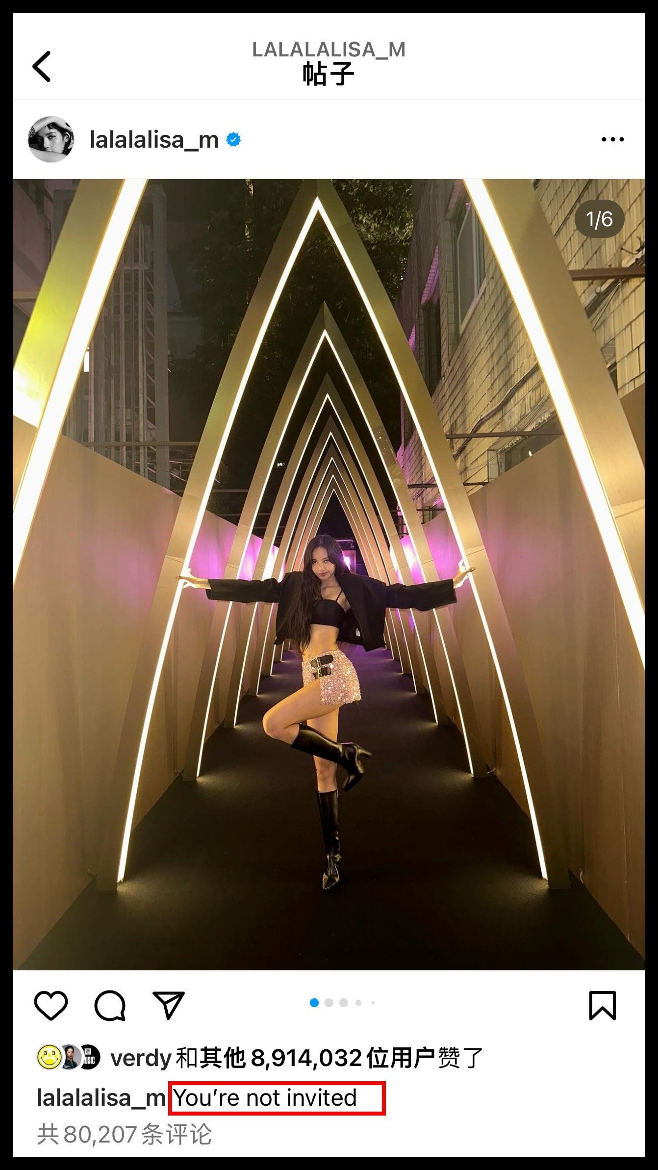 不管怎么说,关于参加疯马秀表演的事情 Lisa 一直没有正面回应,但此前在社交平台配文:You are not invited。