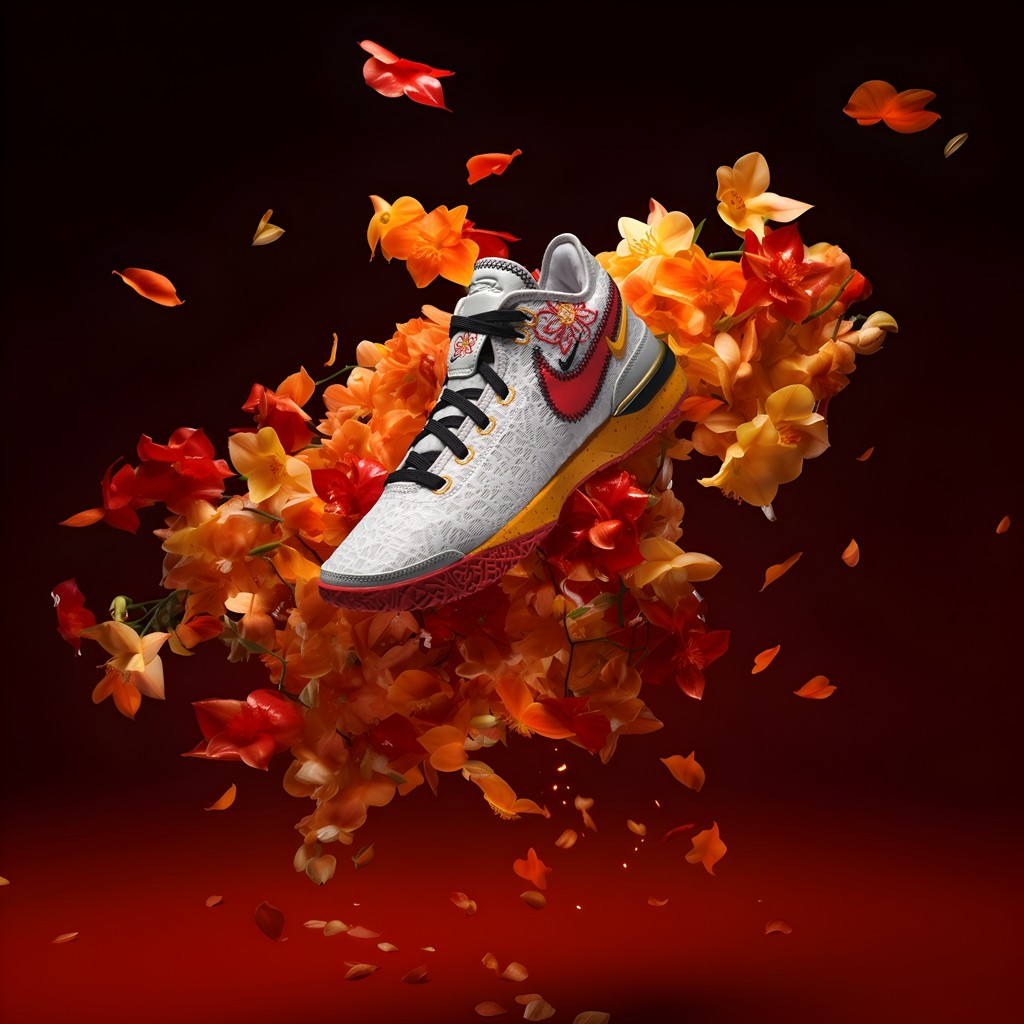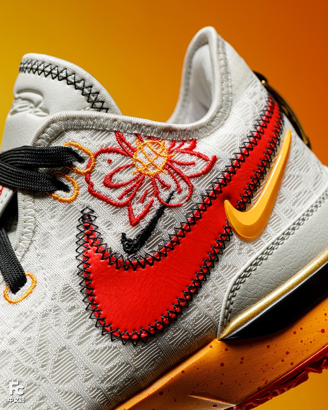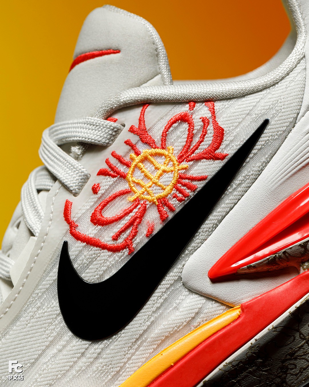 其中最亮眼的设计,当属鞋侧这朵硕大的刺绣花卉,花蕊则是一颗篮球的造型。