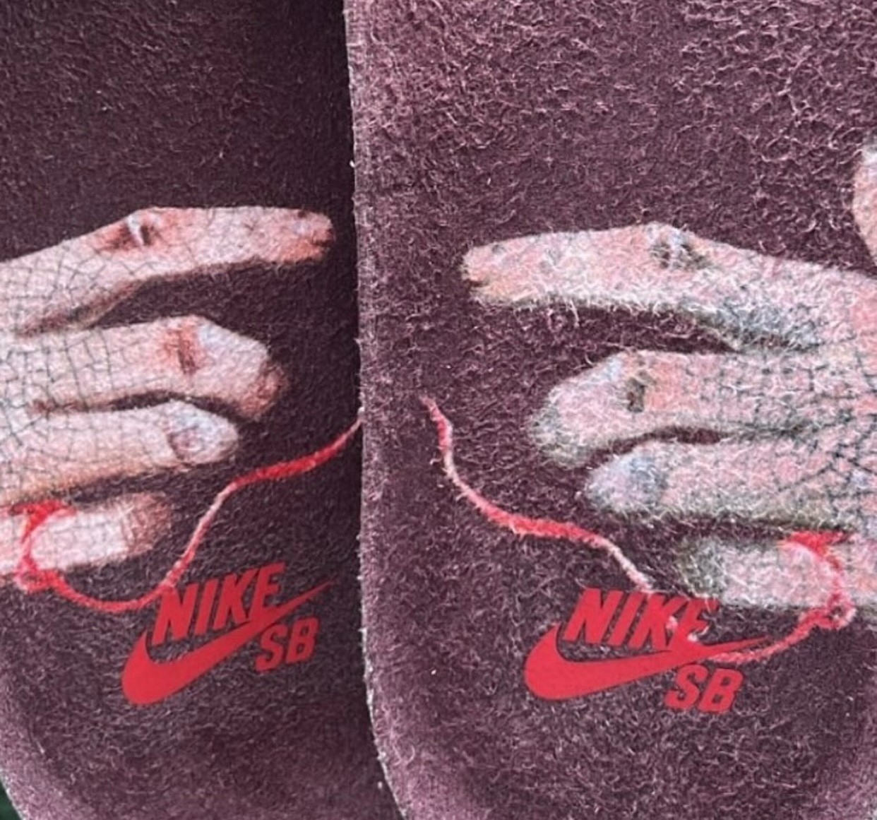 鞋垫处则使用麂皮材质打造,并印有两只手通过绑在小指上的红色绳子连接在一起的图案设计,细节还是很顶的。
