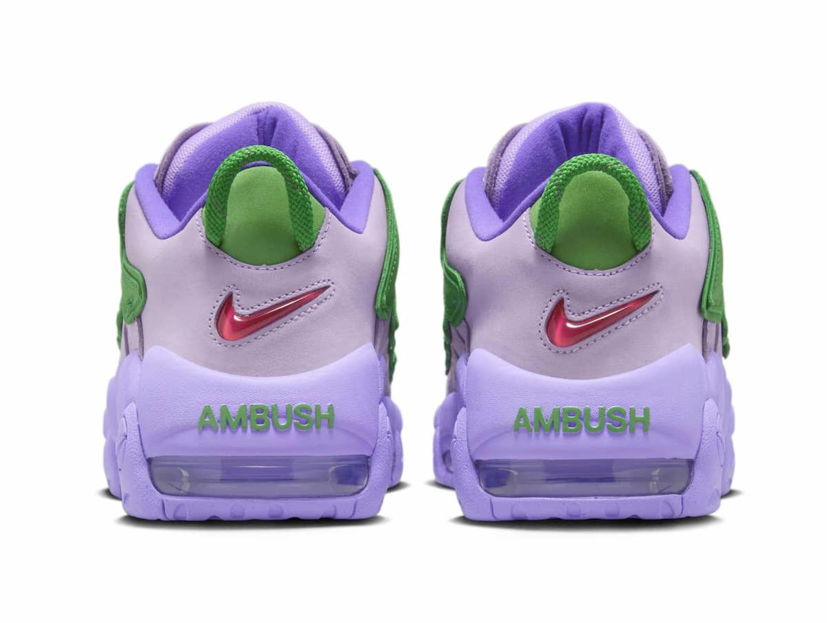 这一联名鞋款的辨识度一流,除了降低了鞋帮高度,鞋舌和后跟都带有「AMBUSH」字样,直截了当的表明了它的联名身份。