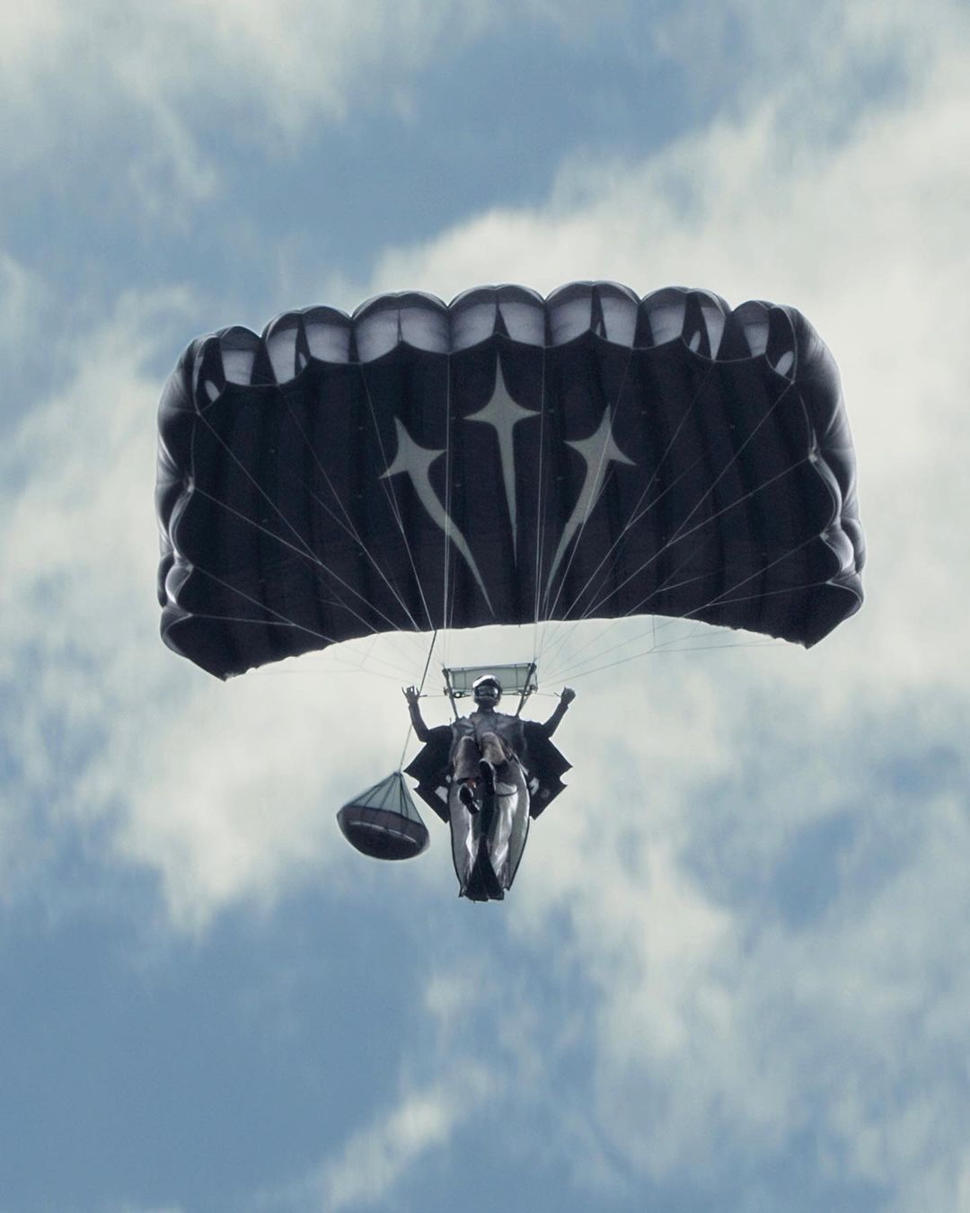 适当高度时,二人同时打开降落伞标志性的「三剑」Logo 也是赫然出现在眼前,进一步诠释品牌身份。