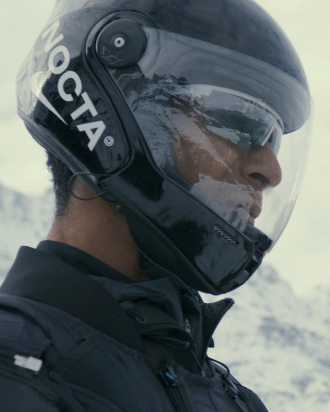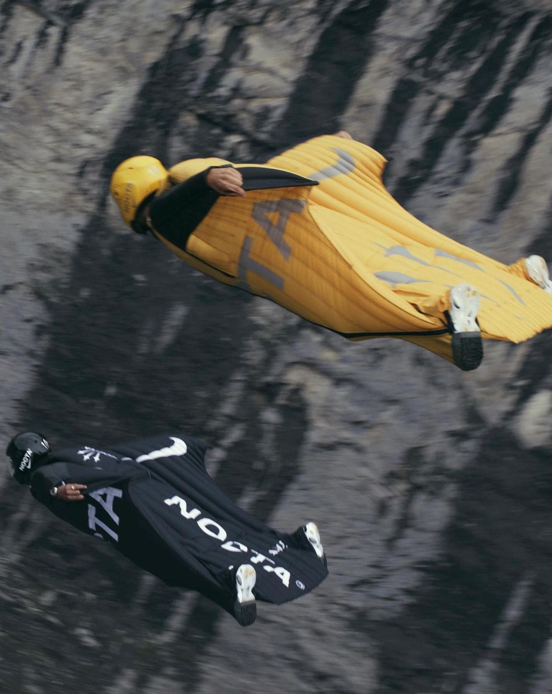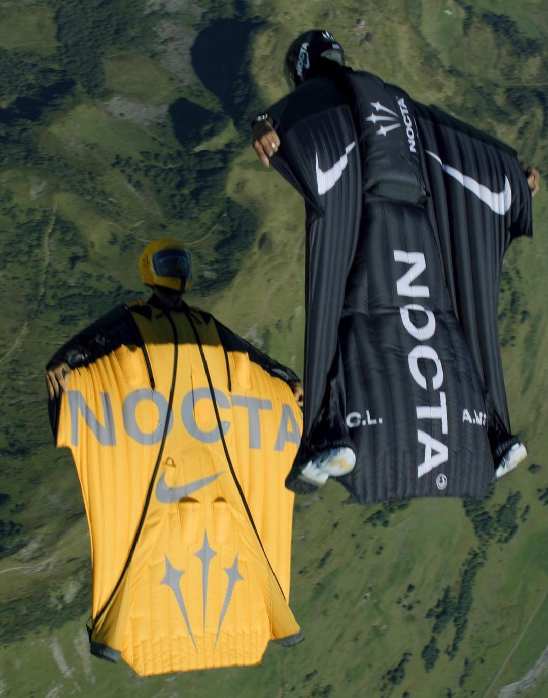 直播中,二人身着 NOCTA 翼装飞行服、头盔以及全新的 Nike NOCTA Glide,从山峰一跃而下。