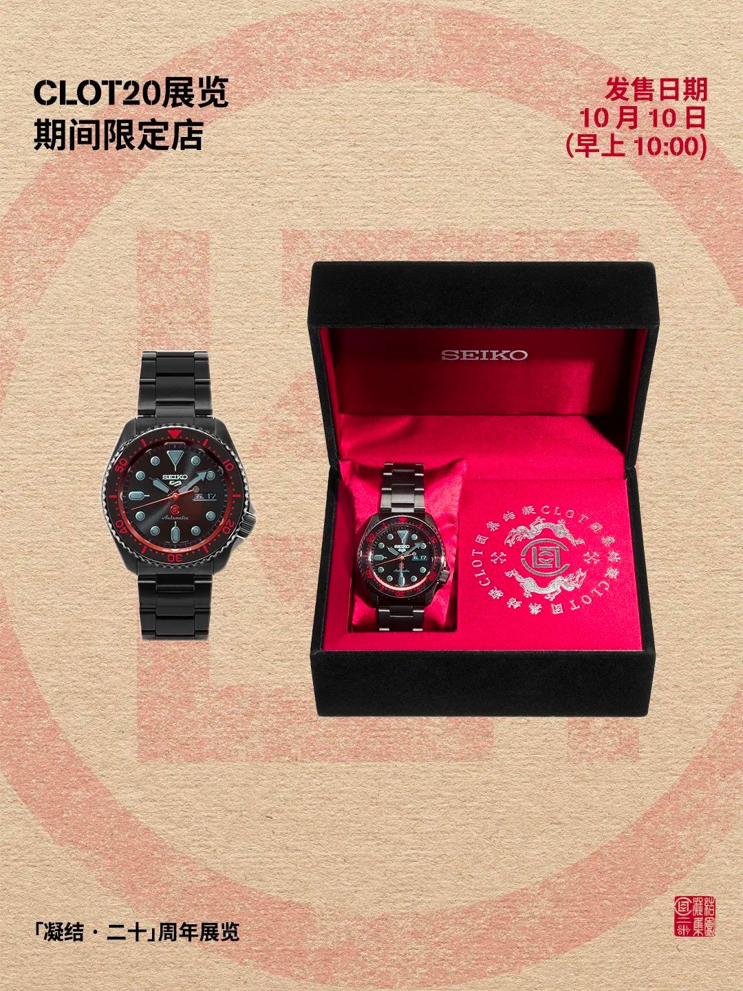 可互换的中英文日历窗口与 6 点钟 CLOT Logo 呼应,并附赠专属纪念礼盒,营造鲜明的东方气质。