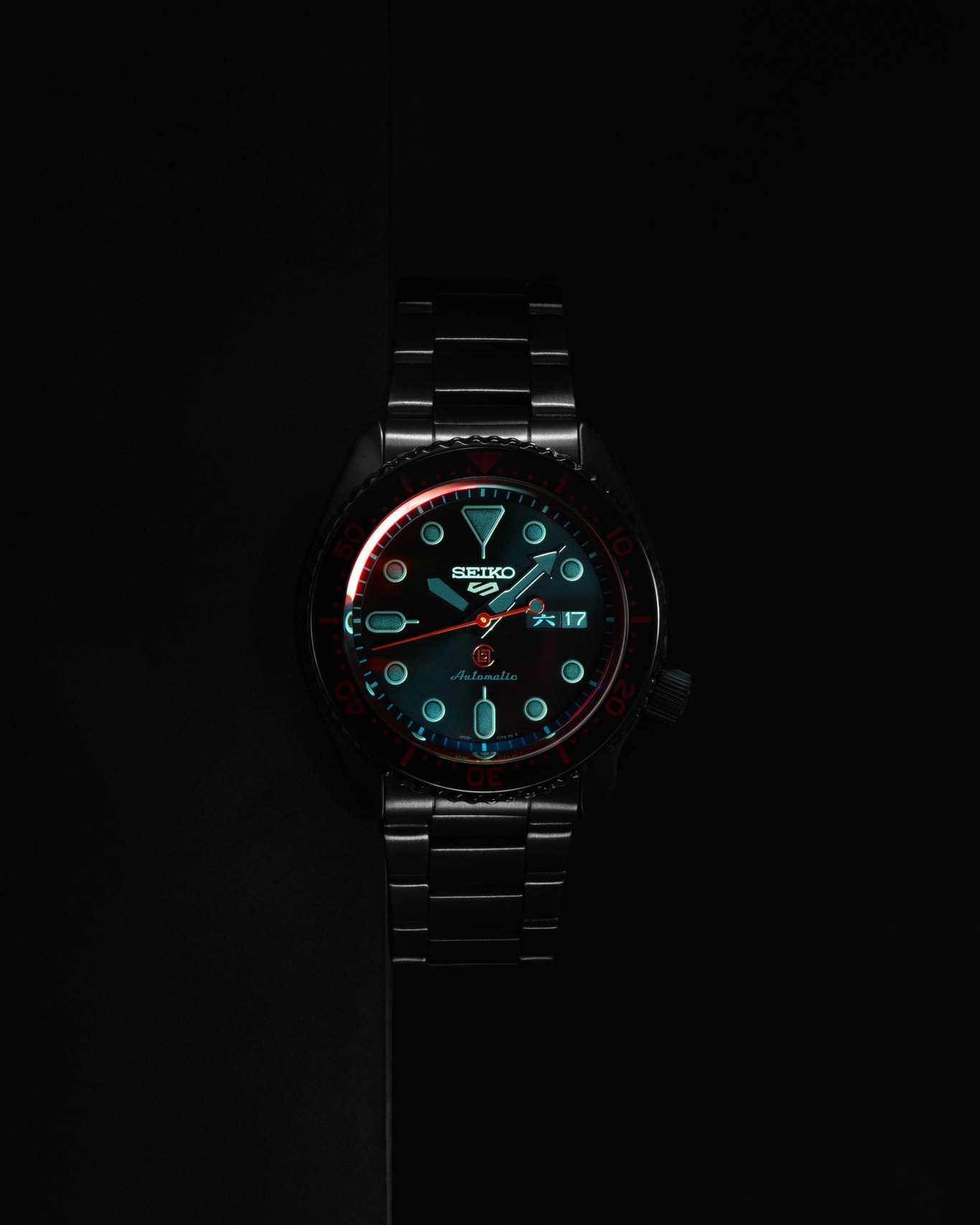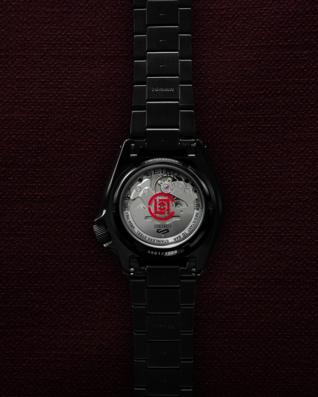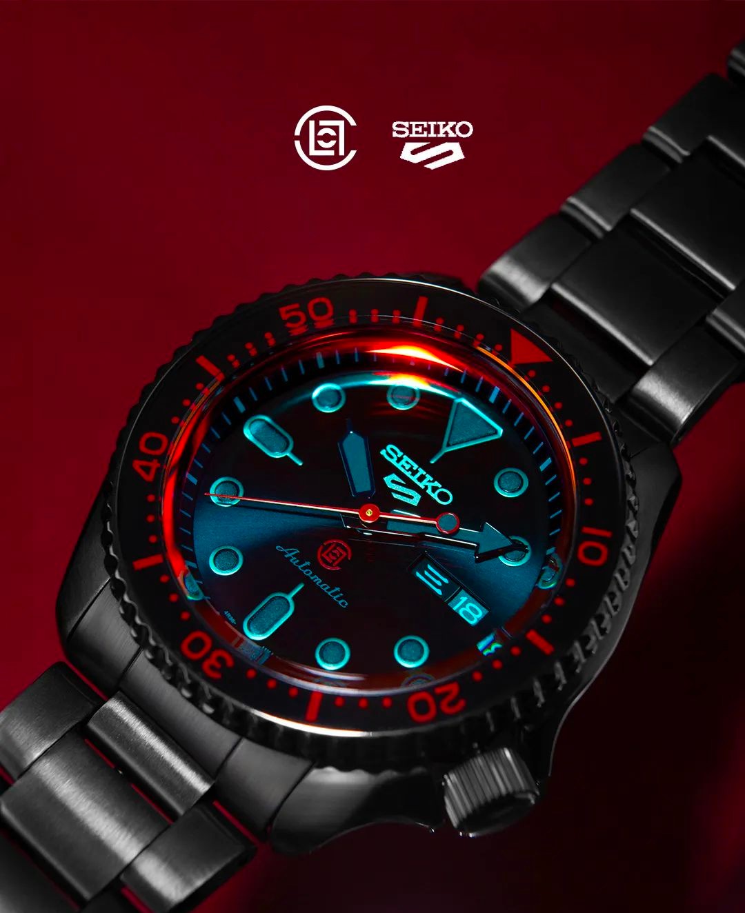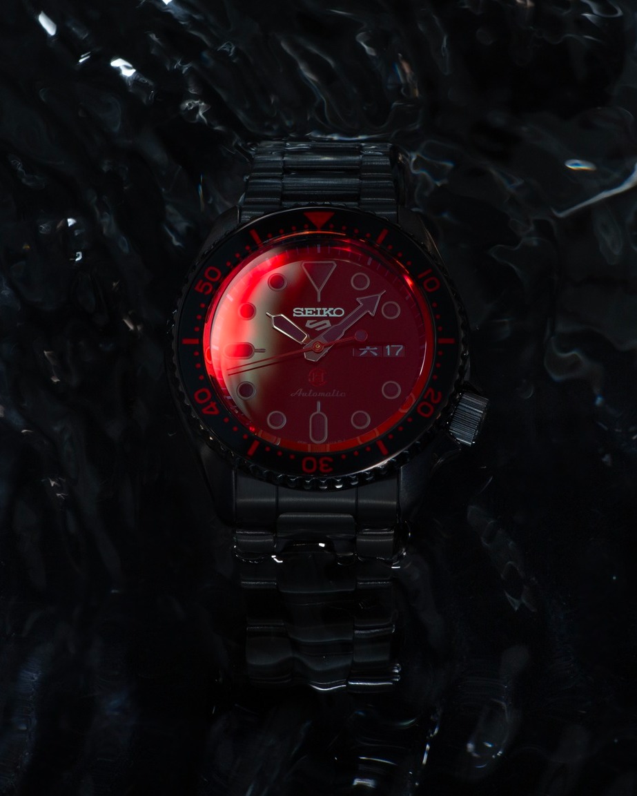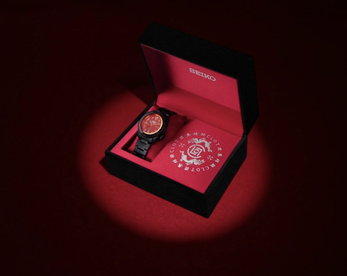其中 CLOT x SEIKO 5 SPORTS 限量腕表采用哑光黑搭配 CLOT 标志性的红色作为点缀,水晶玻璃表面经过了半镜面涂层处理,根据观察角度不同,会闪烁出渐变环绕的红色光芒。