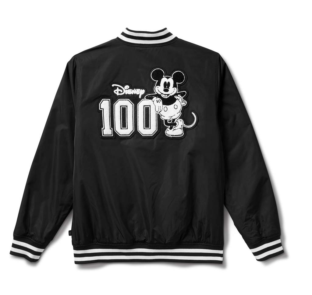 夹克采用宽松版型,选用羊毛混纺面料,在衣服的正反两面增加迪士尼经典 Logo 和米奇刺绣。