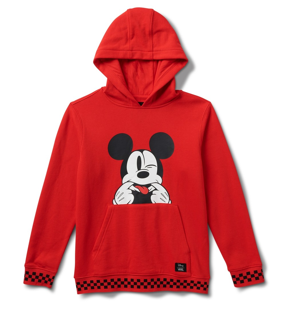 童装方面,红色套头帽衫采用舒适的棉质面料,服饰中央印有活泼可爱的米奇形象。