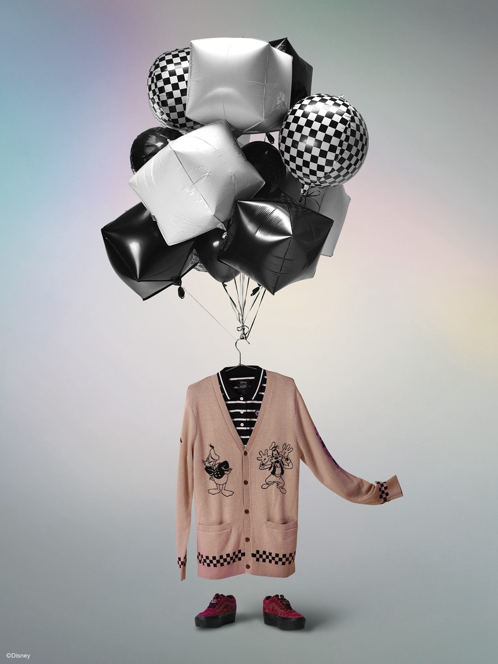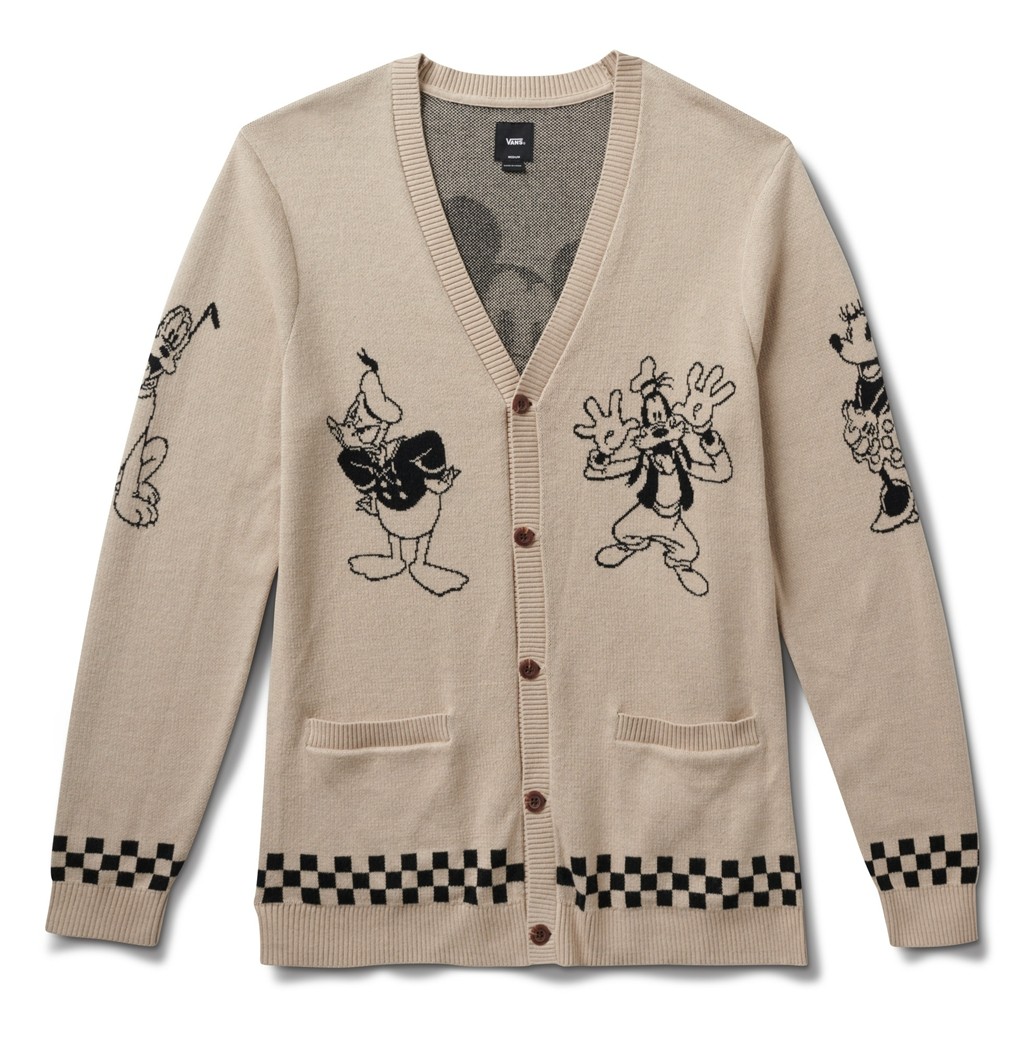 燕麦色的开衫在正面,反面以袖子两侧增加了米奇和他的朋友们的角色印花,下摆则是以 Vans 标志性棋盘格图案进行点缀。