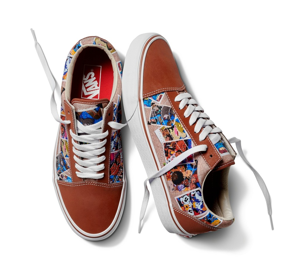 Old Skool 鞋款以棕色为主色调,摘取部分迪士尼热门故事中的主要人物为印花,以剪贴画的形式呈现。