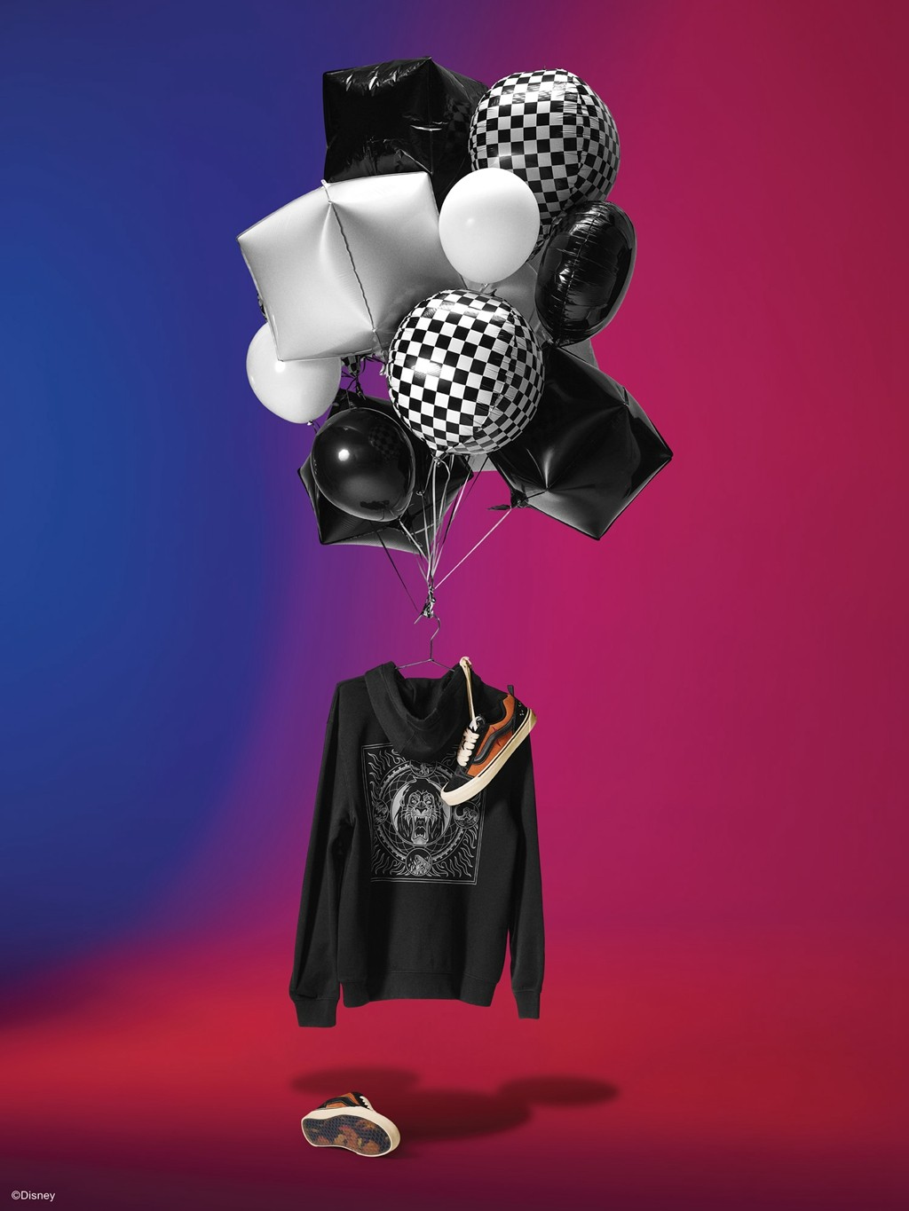 以反派形象为设计元素的服装产品,囊括了黑白条纹 Polo 衫,通过胸口苹果标签联结反派形象,辣椒红贾方短袖 T 恤和黑色刀疤套头帽衫,以满足 Vans 和迪士尼爱好者的多样穿搭需求。