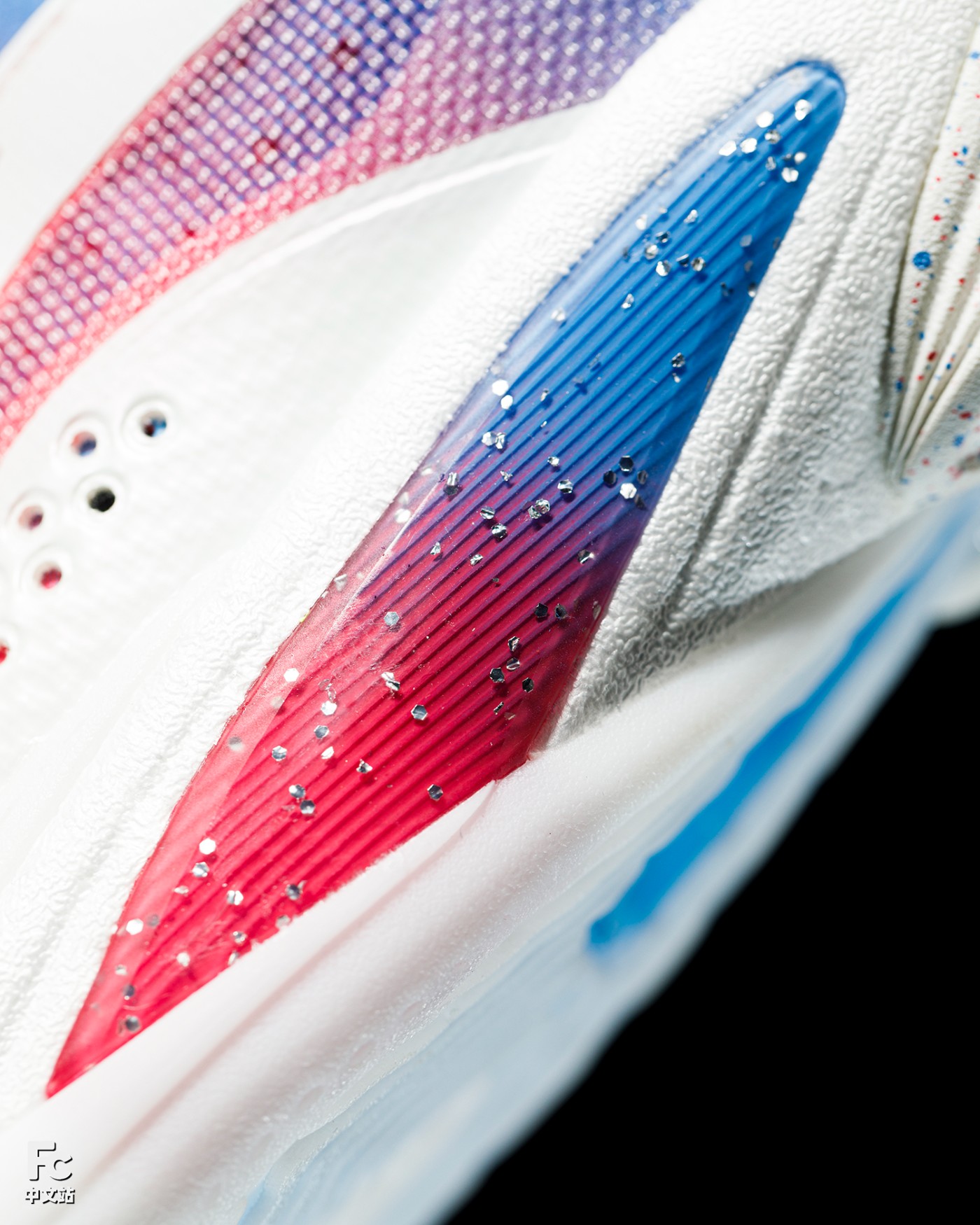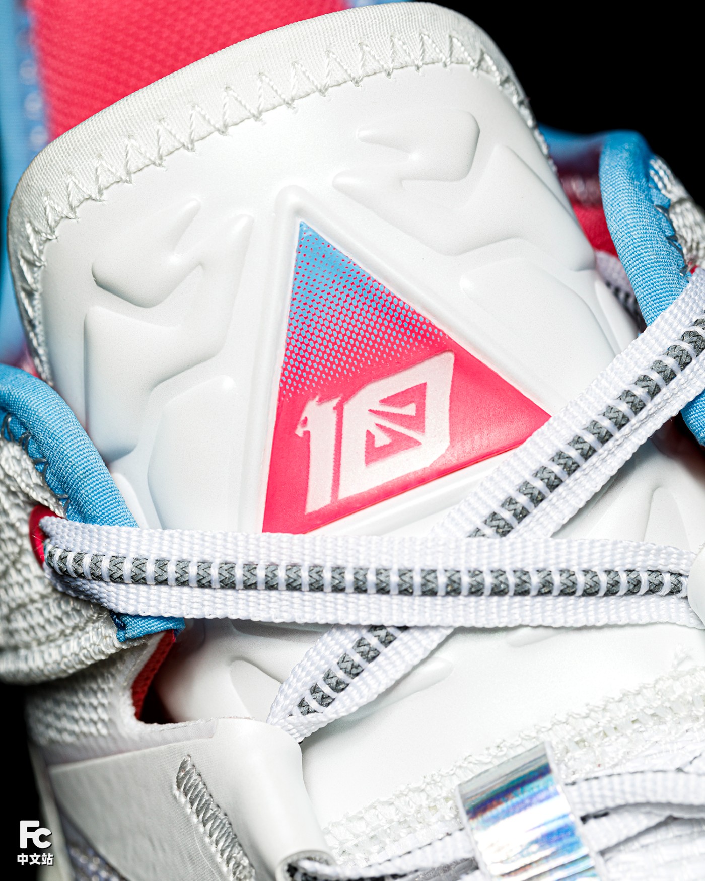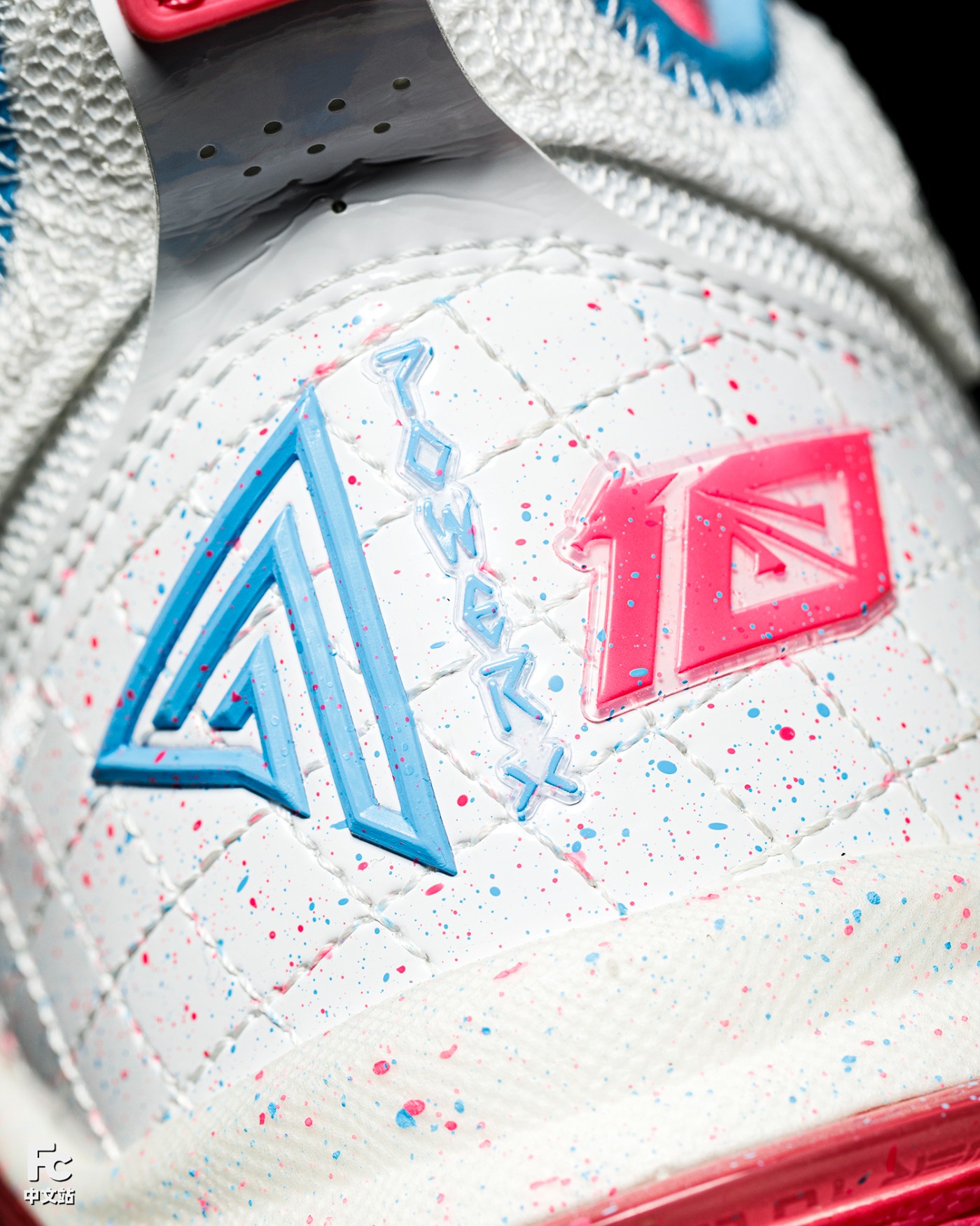 细节方面,侧墙 TPU 双色渐变加银粉效果,鞋舌处印有 10 字样,彰显联名鞋款身份。
