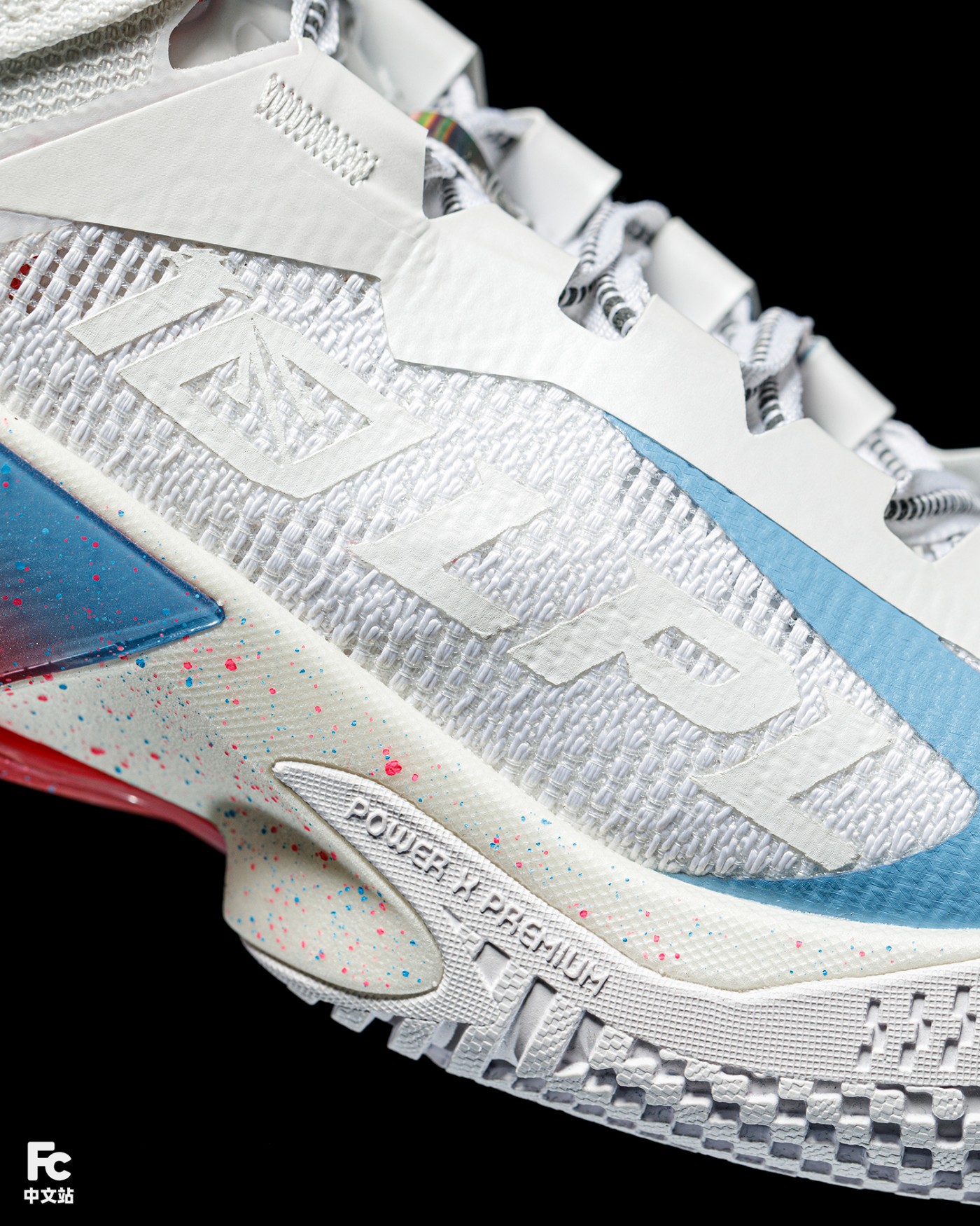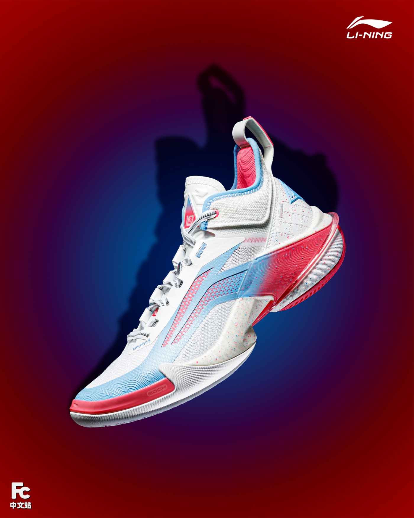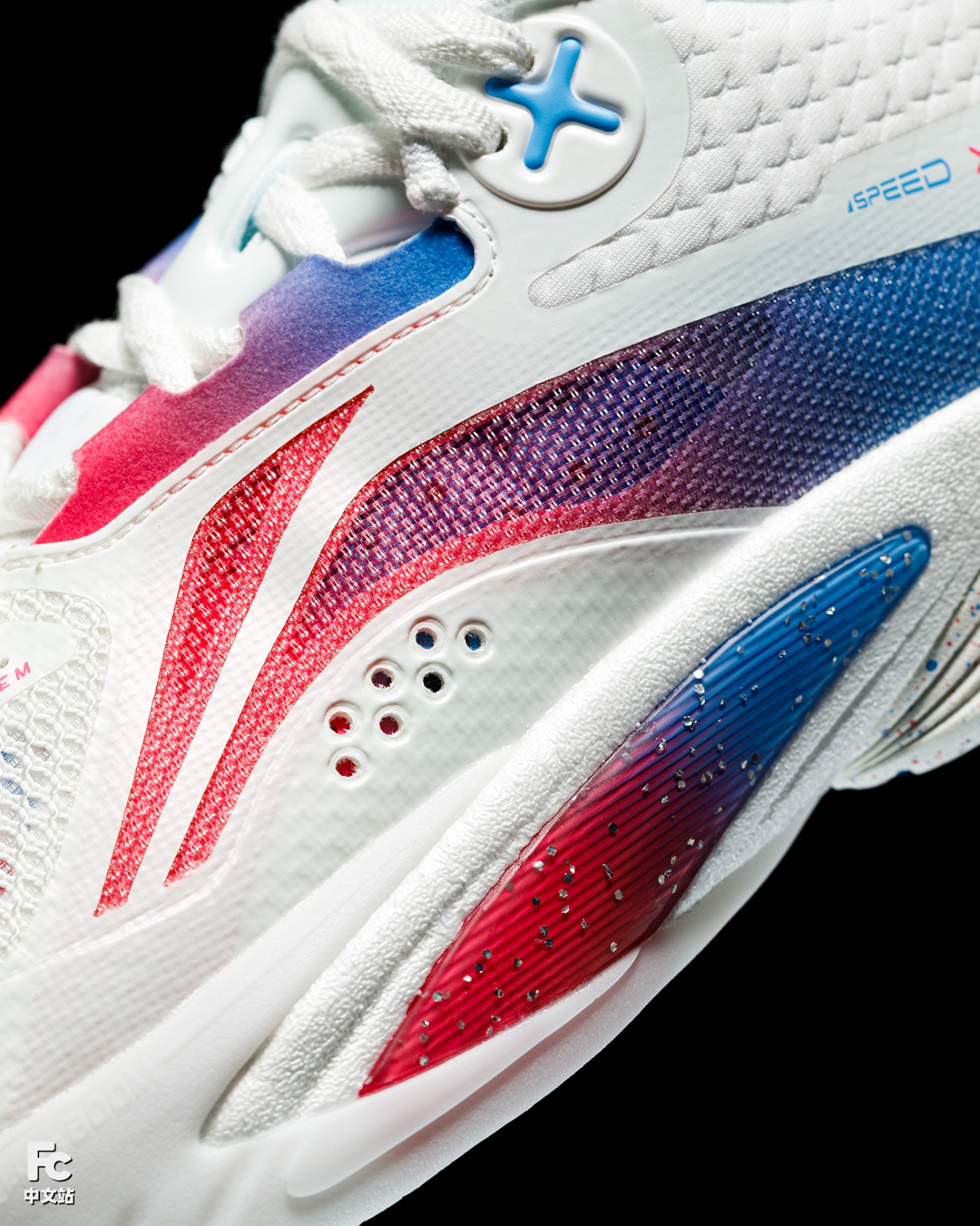先说李宁闪击 10,整体大面积白色覆面,粉蓝渐变点缀,呈现出 LPL 标志性的蓝红撞色,视觉效果拉满。
