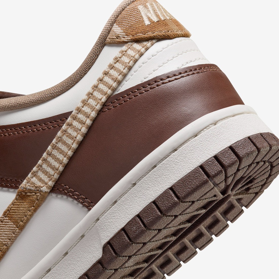 鞋身由白色与棕色组成,侧身 Swoosh 还将原本造型换成了格纹绒布,完美呼应当下流行的「美拉德」穿搭。