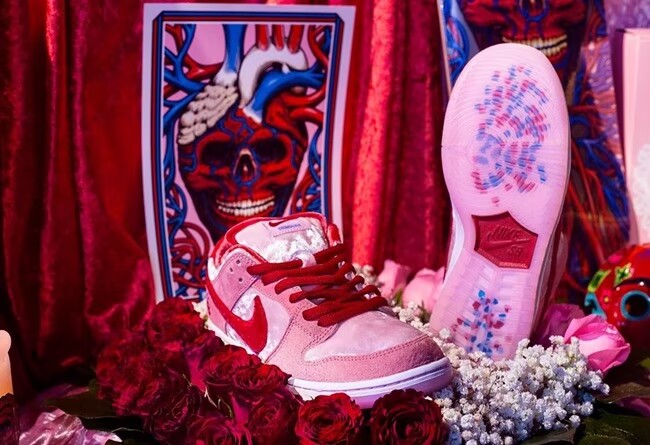 整双鞋采用白色和粉色拼接,深红色 Swoosh 点缀,呈现出浓郁的「情人节」氛围,跟之前的 StrangeLove x Nike Dunk SB Low 有些神似。