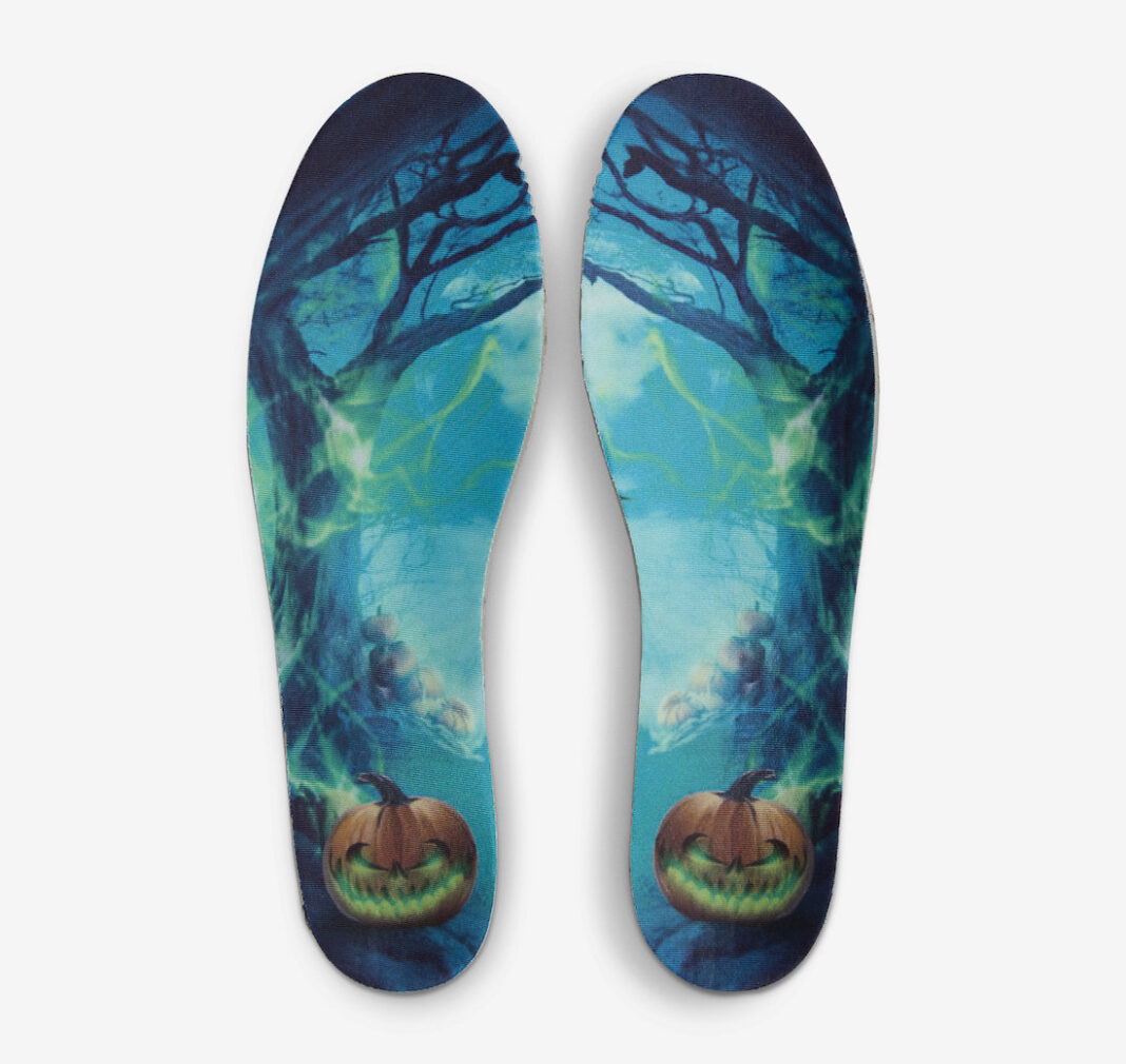 鞋垫的设计也非常独特,背景是森林氛围,配合散着绿光的南瓜元素,完美呼应万圣节主题。