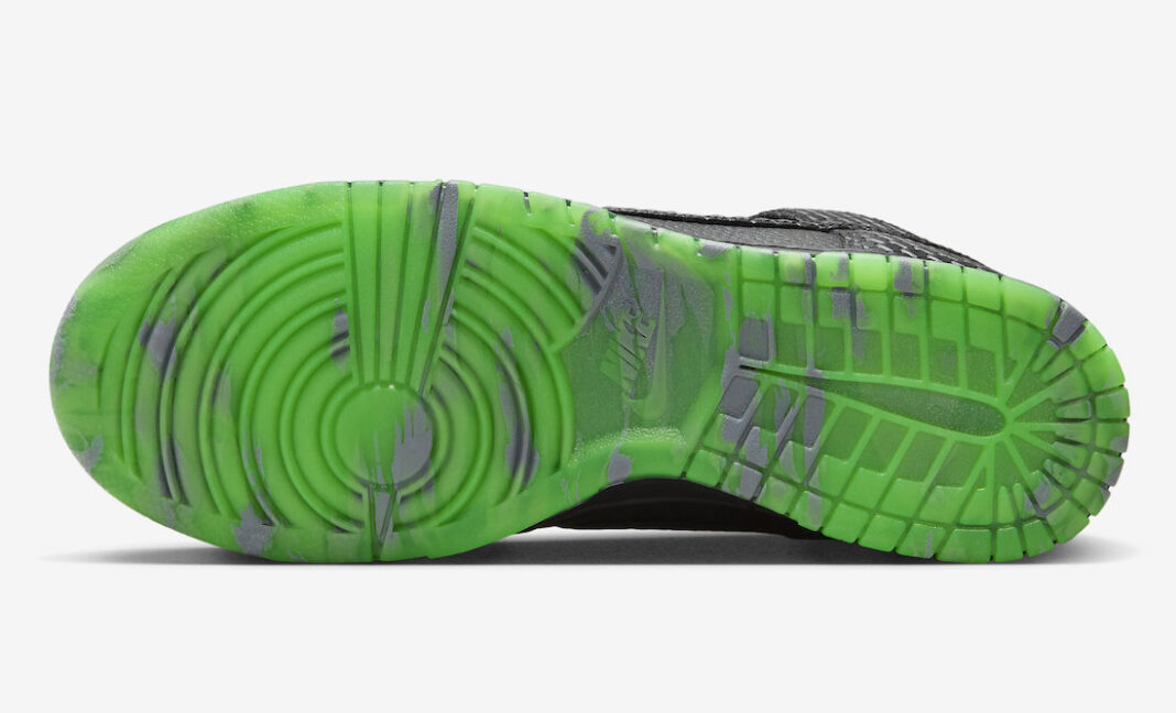 配色方面,黑色调鞋面、绿色外底,散发出令人不寒而栗的恐怖气氛。