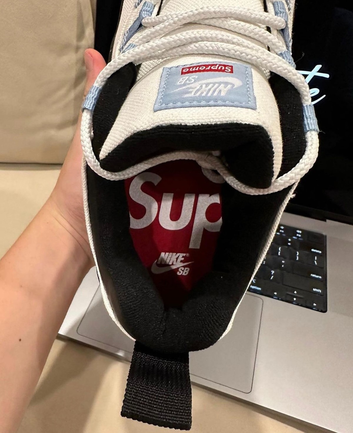 细节方面自然是侧身、鞋舌及鞋垫上出现的 Supreme Logo,将联名身份一览无遗。