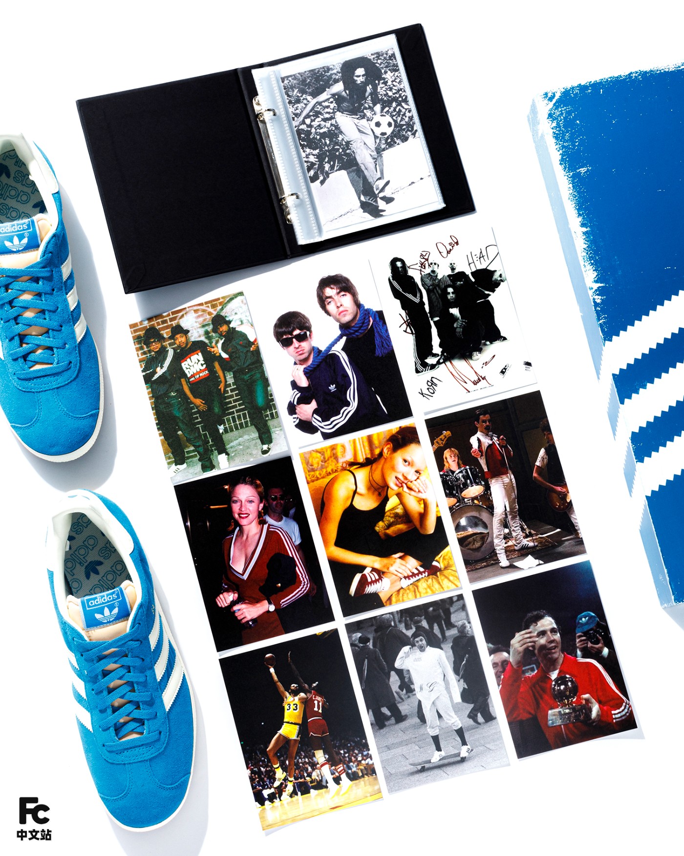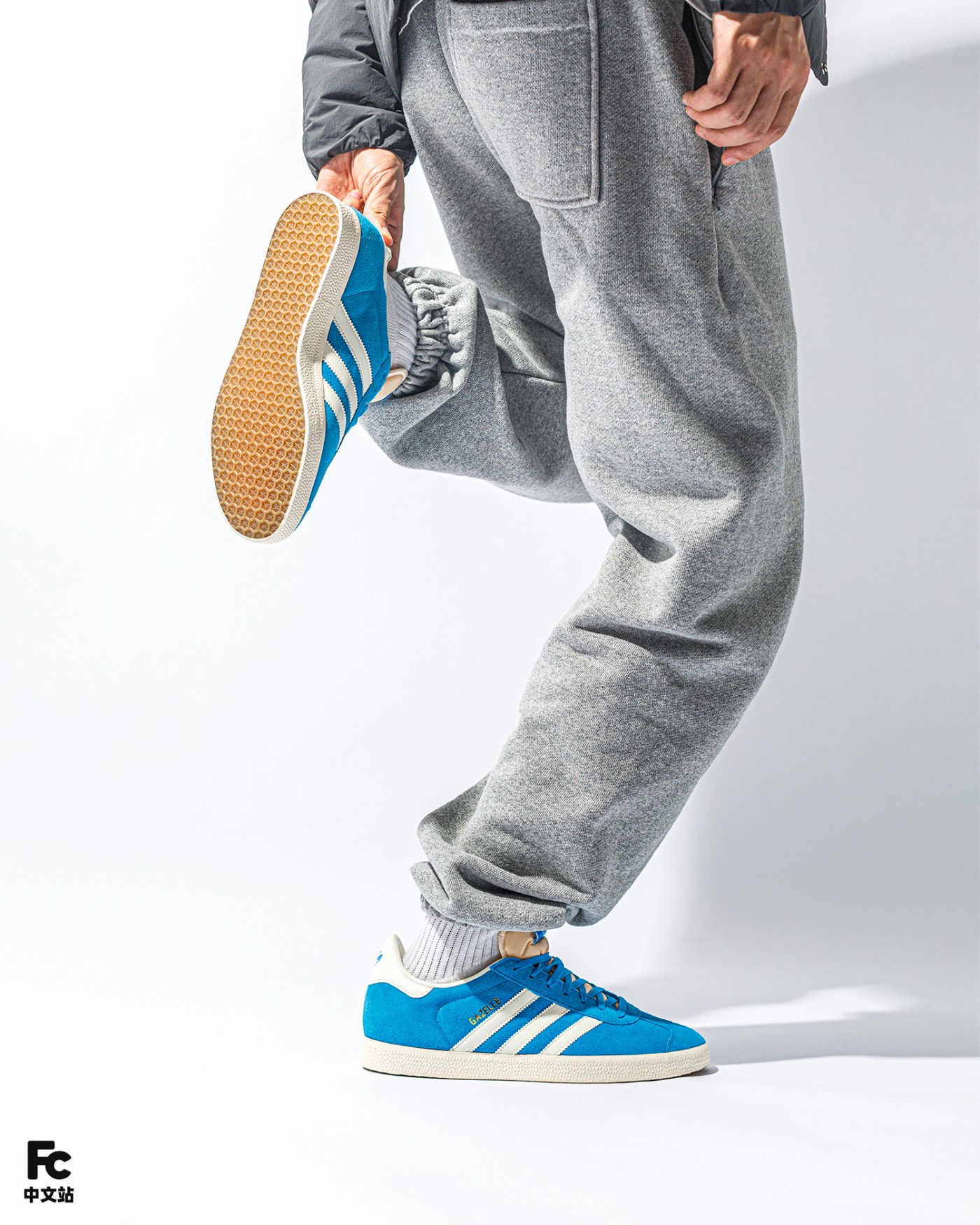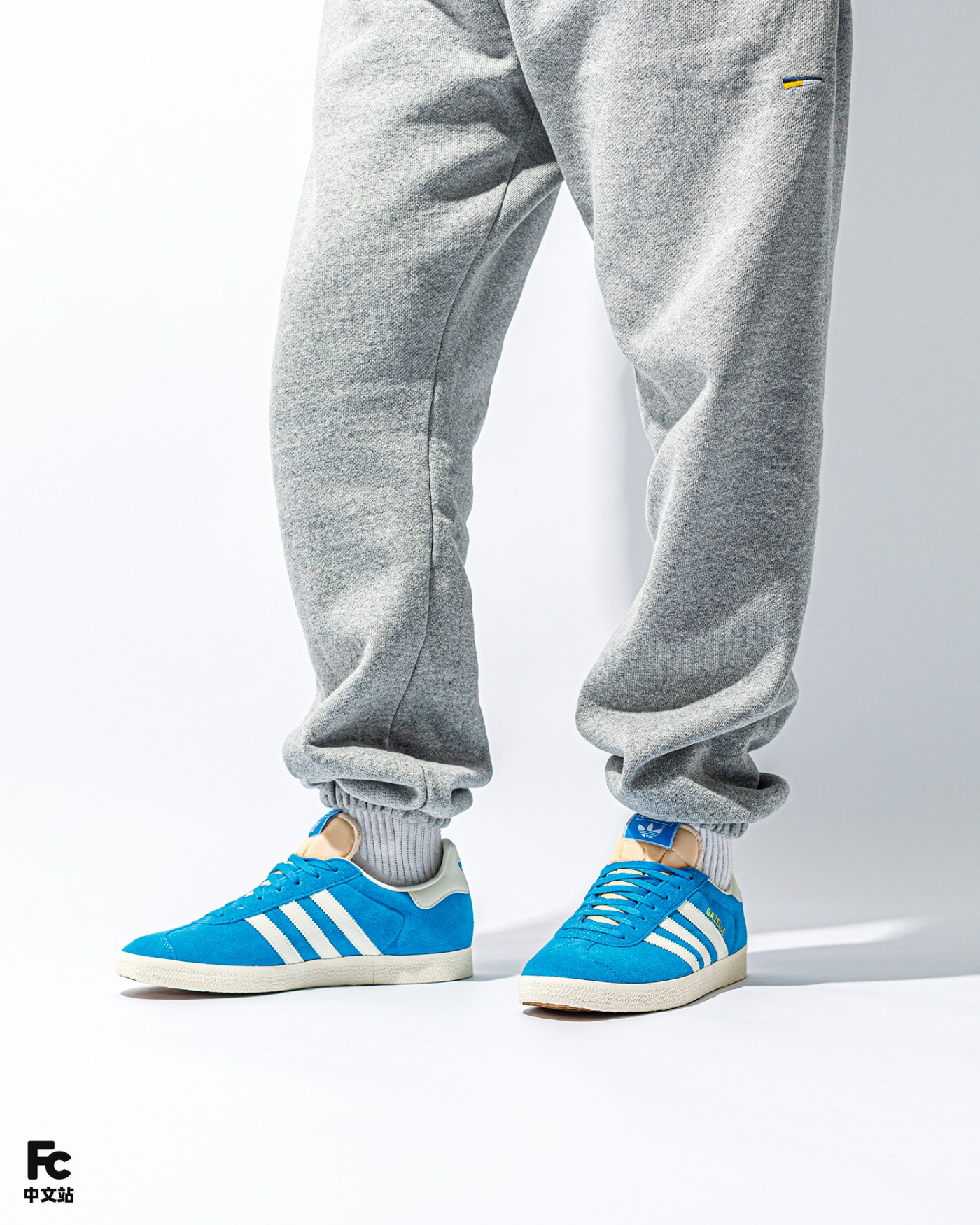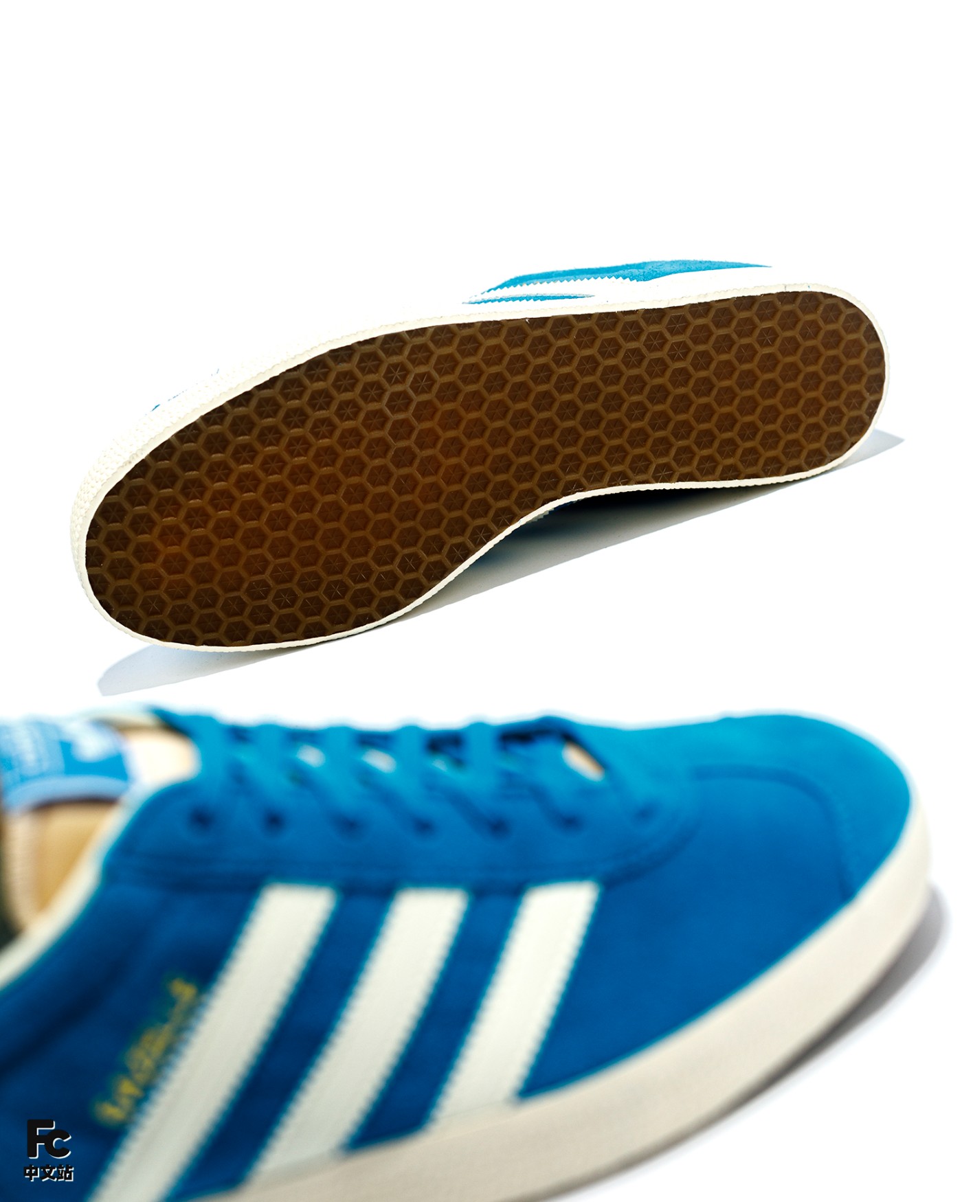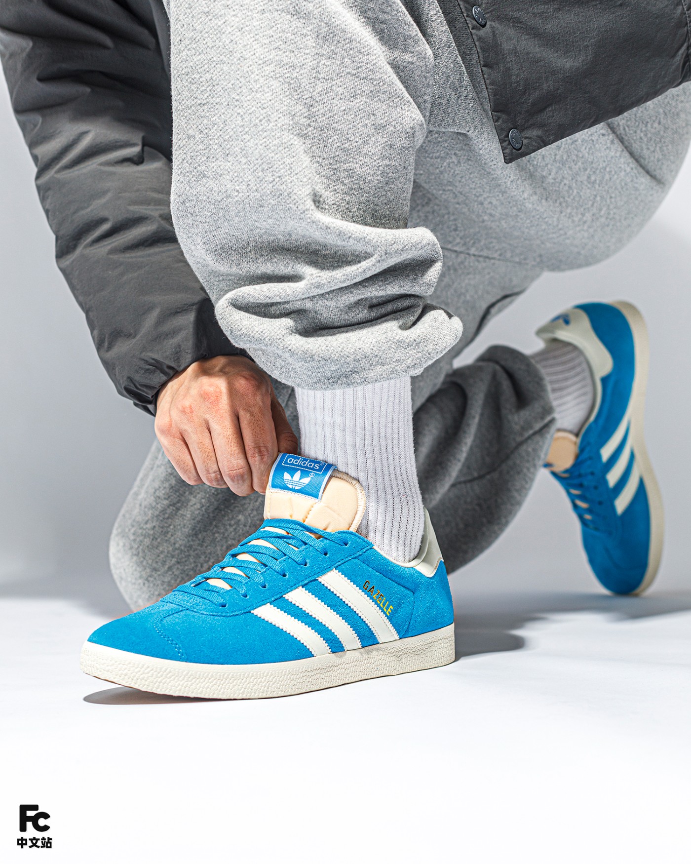 先说球鞋,整双鞋以经典的 Gazelle 鞋型为蓝本,整体大面积蓝色覆面,白色三道杠 Logo 点缀,复古气质十足。
