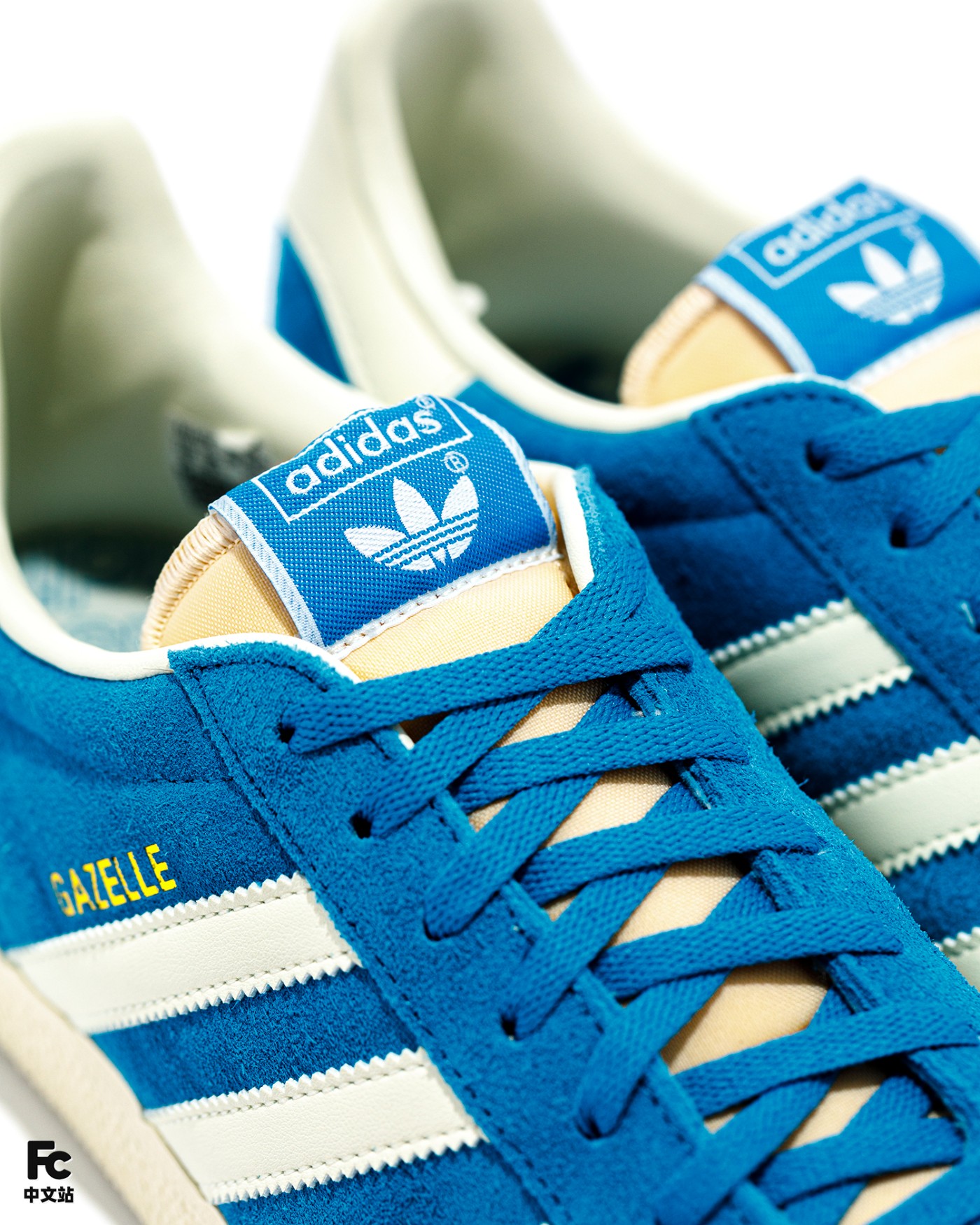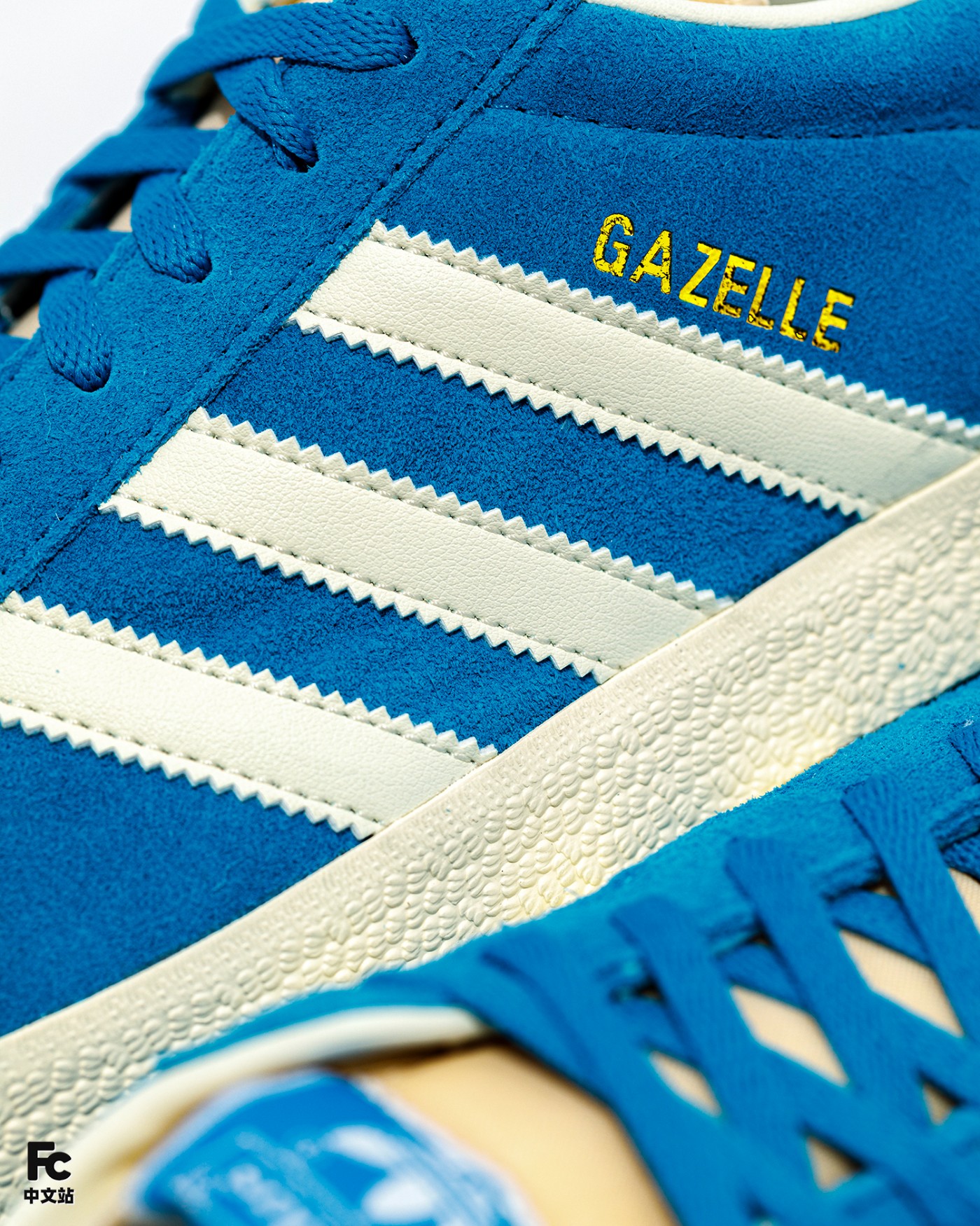 鞋侧面和鞋舌处分别印有烫金 Gazelle 字样和三叶草 Logo,彰显鞋款身份。