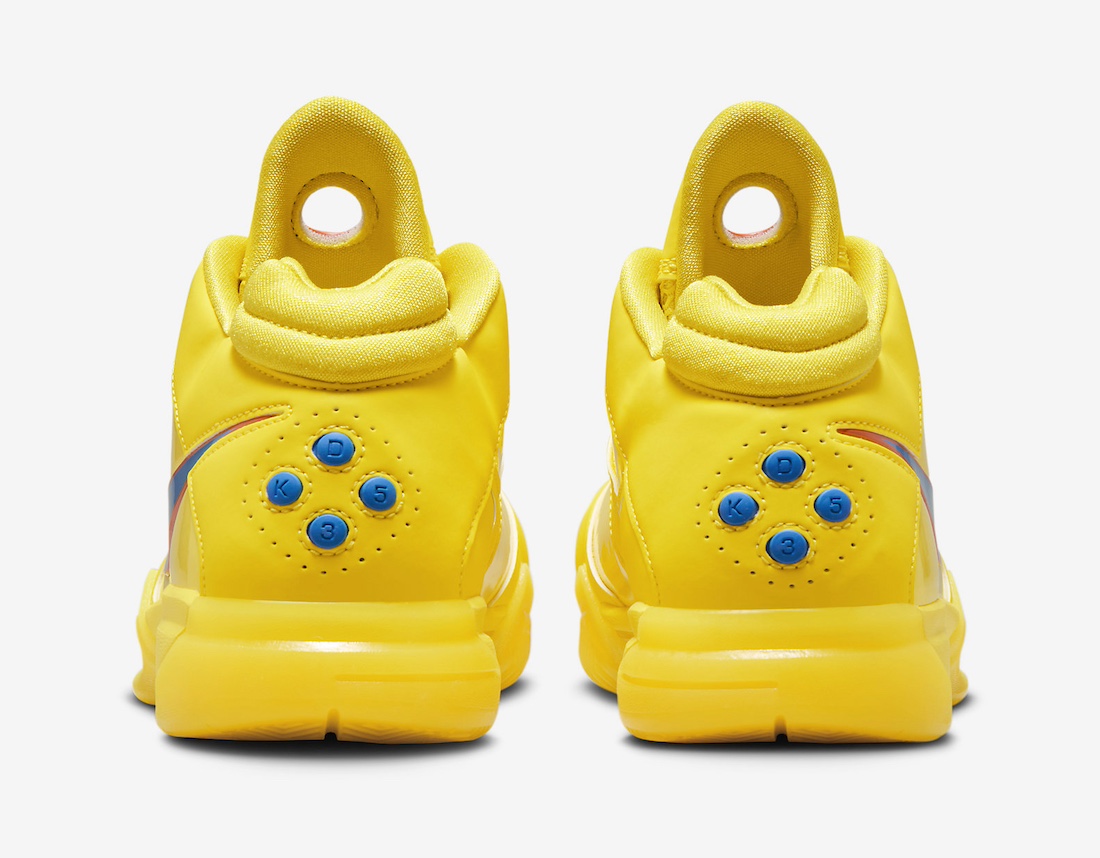 整双鞋与十三年前的造型一致使用了大面积黄色 + 蓝色组成,视觉效果格外醒目,这也与当年俄克拉荷马雷霆队主调形成了呼应。