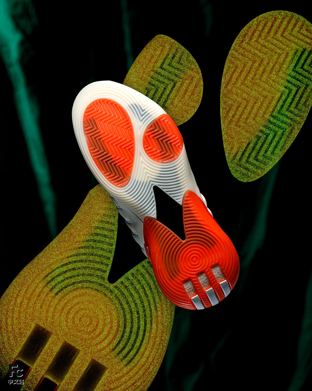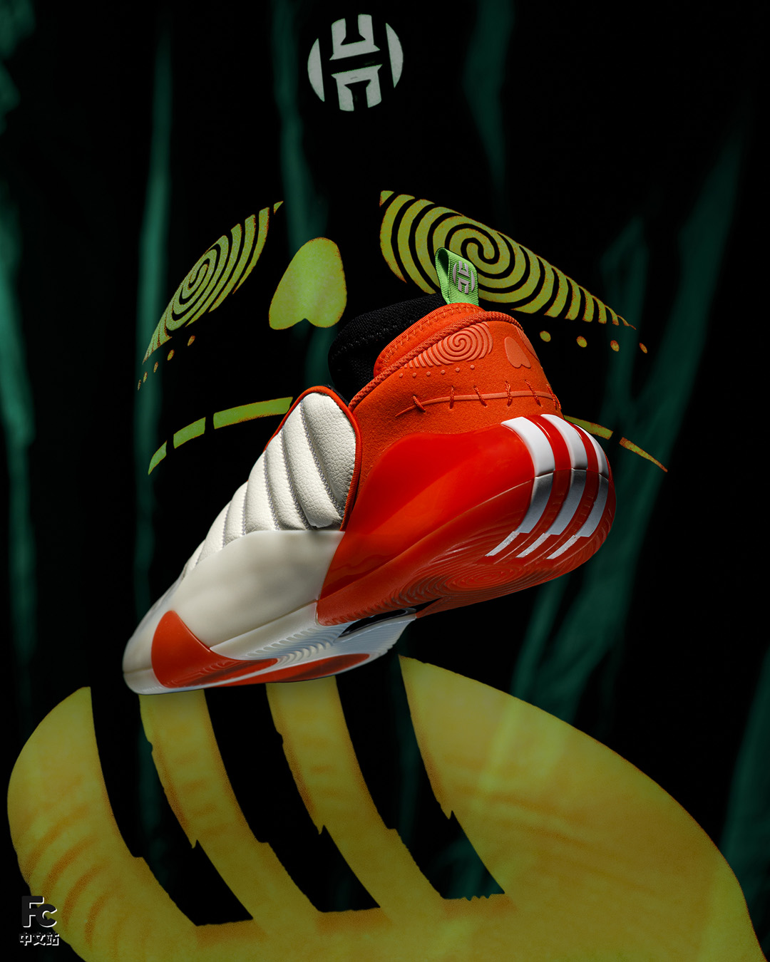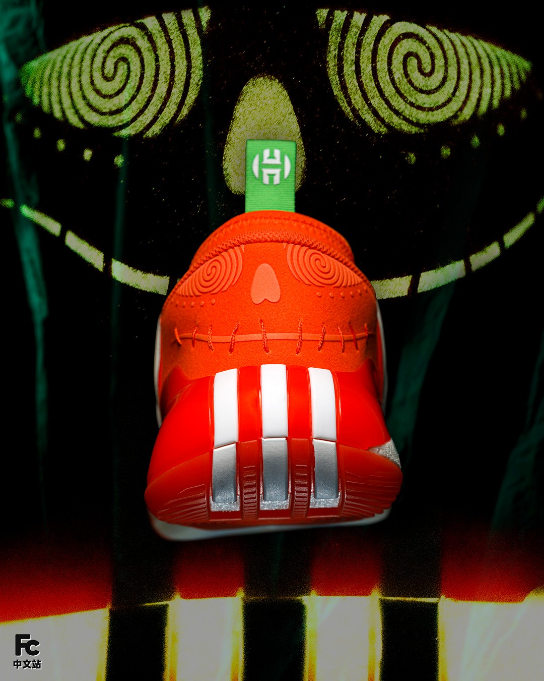 更不用说后跟的鬼脸,旋涡般的眼神看久了真有种要被催眠的感觉,另外就连鞋提上的哈登 Logo 都能散发荧光,细节拿捏得相当到位。