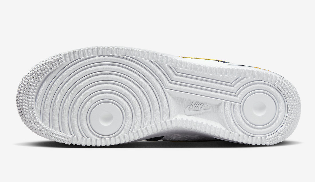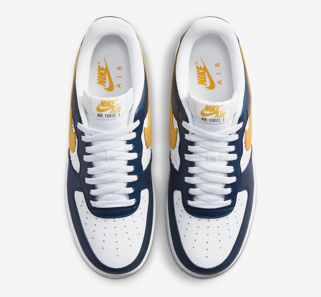 整双鞋采用大面积白色和蓝色,搭配黄色 Swoosh 点缀,还原密西根球衣配色。