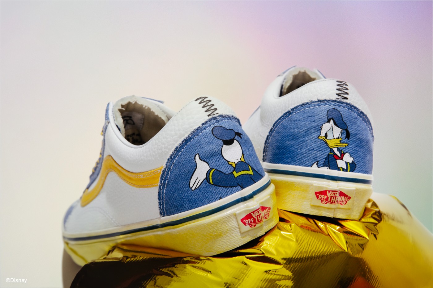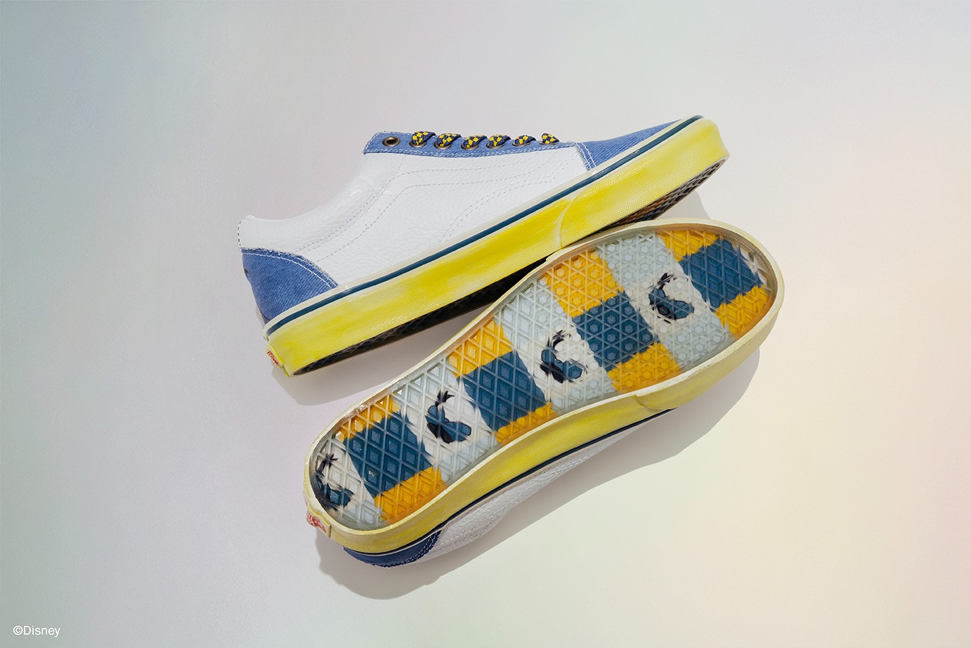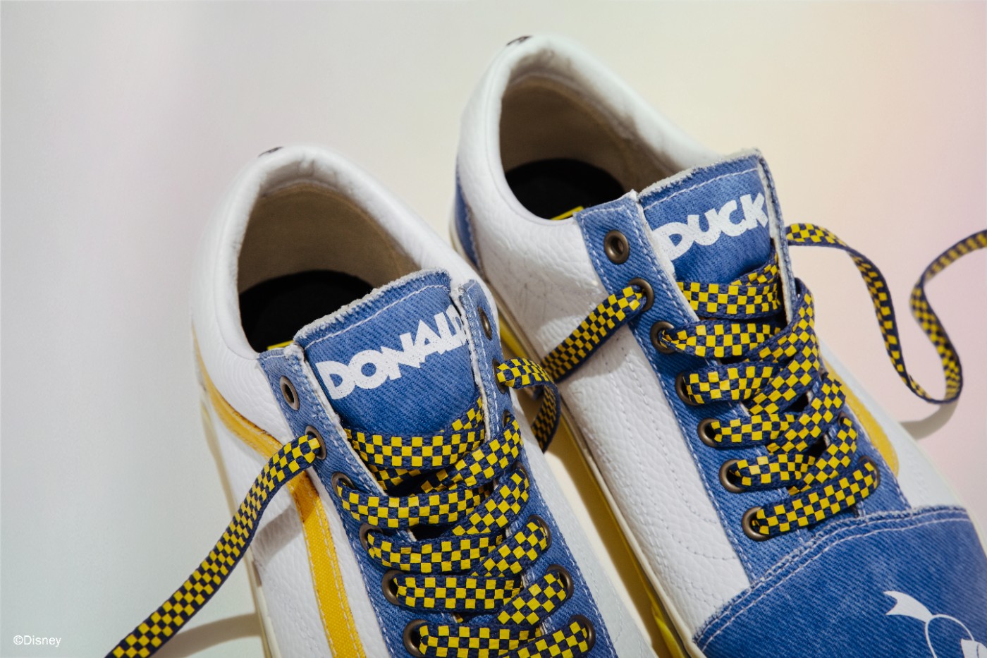 第二双以唐老鸭为灵感设计,采用 Old Skool 鞋型进行创作,蓝白色覆面,鞋后跟处还有唐老鸭造型,彰显鞋款身份。