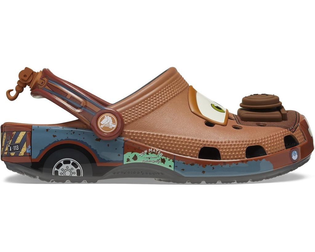恰逢迪士尼 100 周年,越来越多的相关产品陆续曝光,这次又轮到了咱们熟悉的 Crocs。 这次,Crocs 携手迪士尼旗下皮克斯动画工作室,以经典动画电影《汽车总动员》为主题带来新鞋。 不过本次并没有以主角闪电麦昆为灵感,而是选择另一个人气角色 Mater。 生锈卡车的形象被 Crocs 演绎地惟妙惟肖,更是用智必星的方式呈现出角色眼睛和油嘴。 后跟绑带上还有 Mater 最经典的拖钩细节,玩味十足。 据悉,全新《汽车总动员》x Crocs Clog “Mater” 现已率先在海外上架。