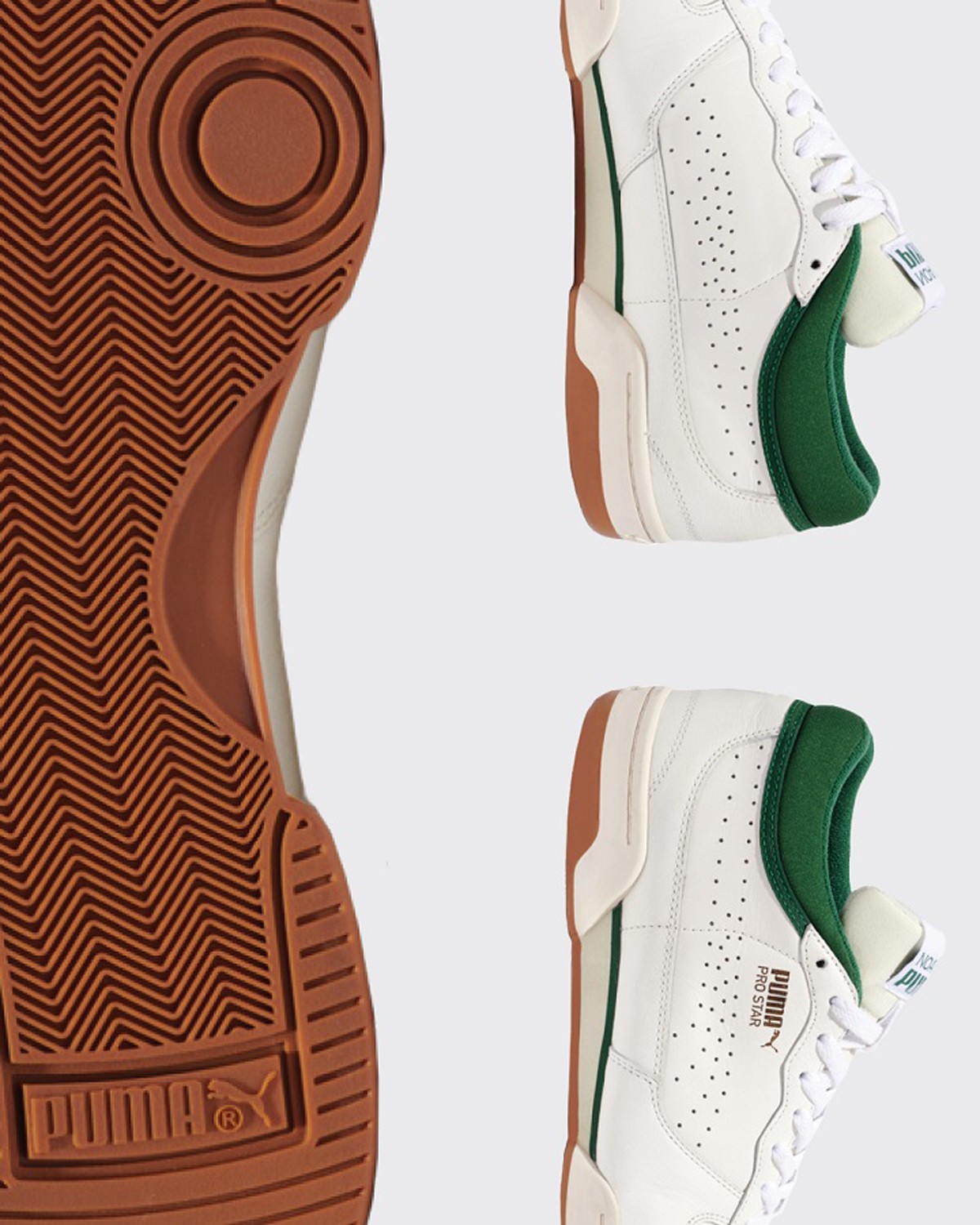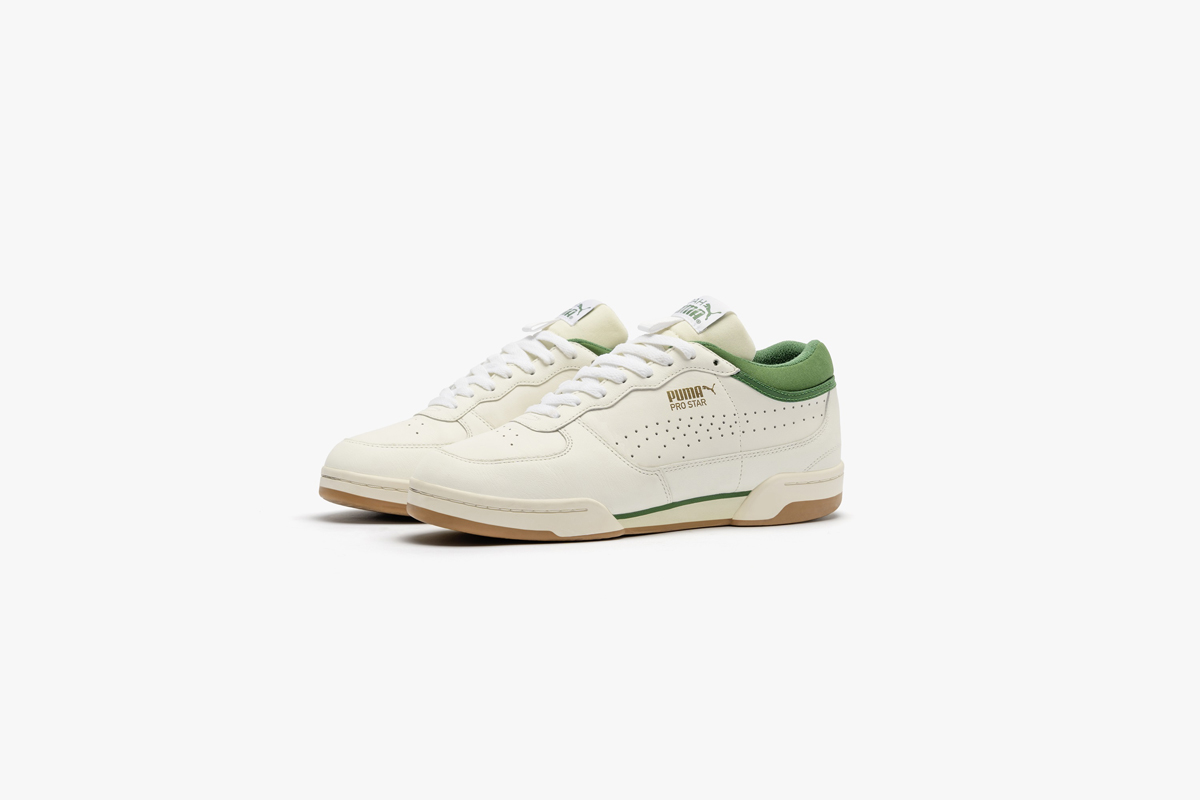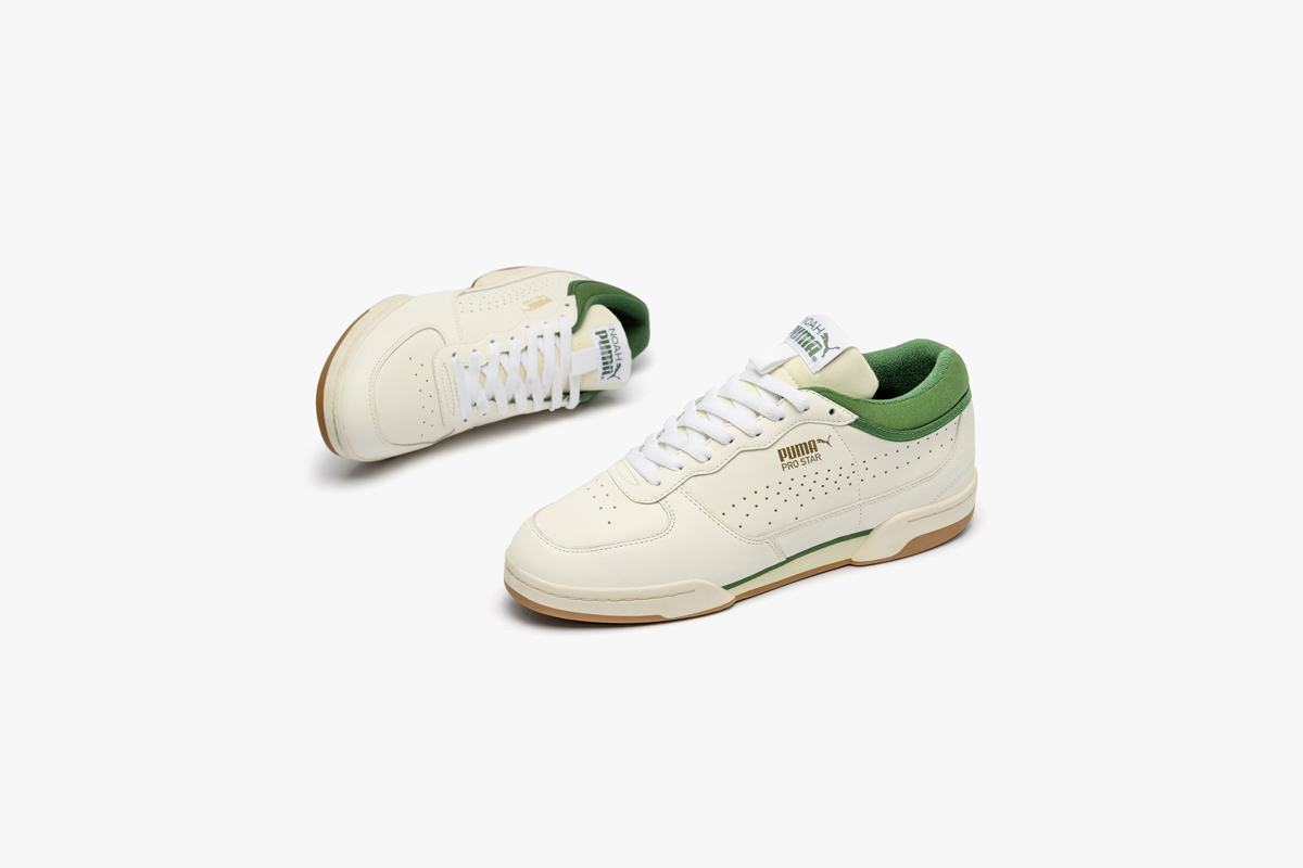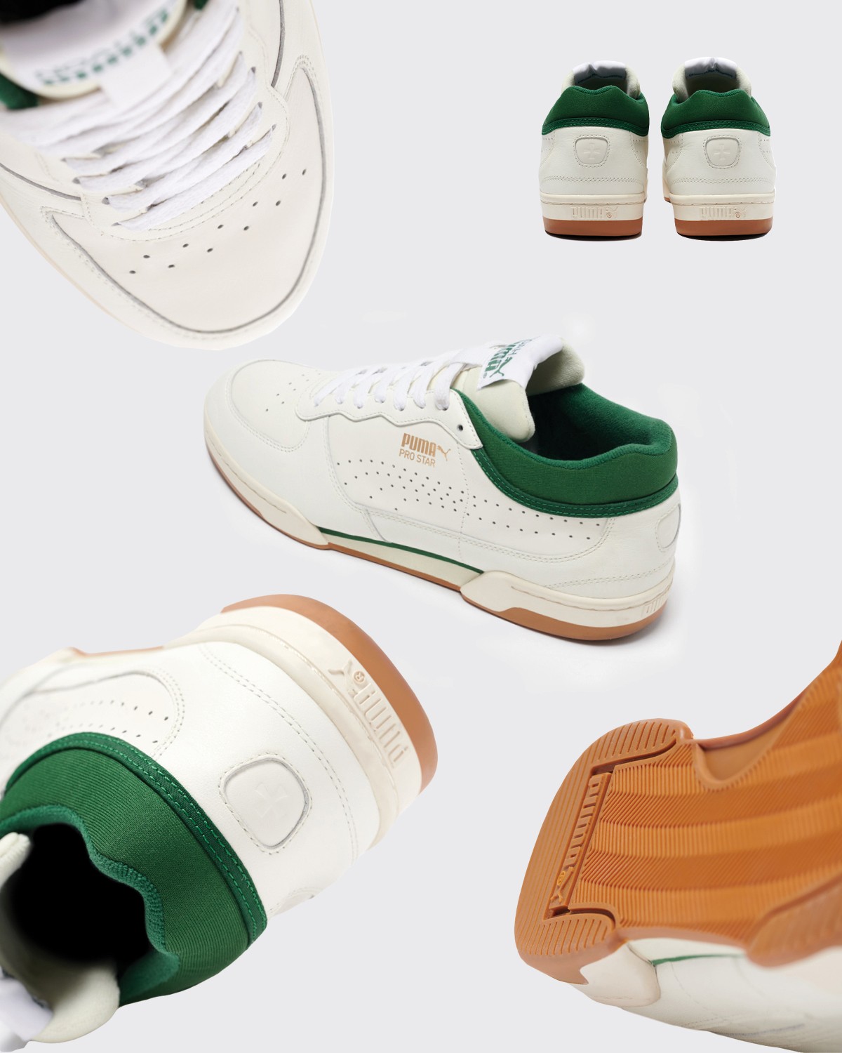 鞋款上选择了 PUMA Pro Star 为蓝本创作,奶白色的鞋身辅以绿色点缀,再搭配上卡其色橡胶外底,直接将复古质感稳稳拿捏,搭配起来更是毫无难度。