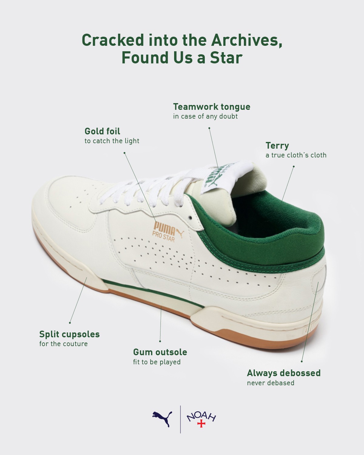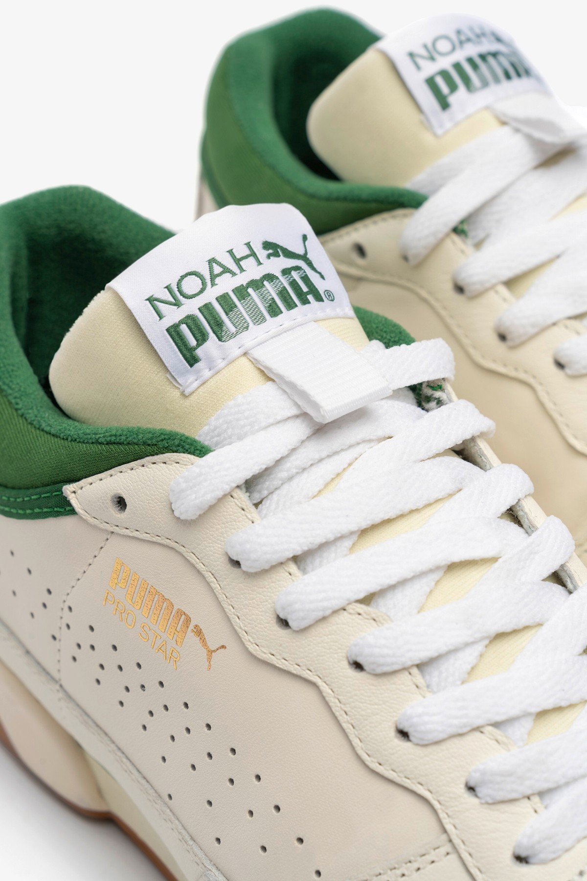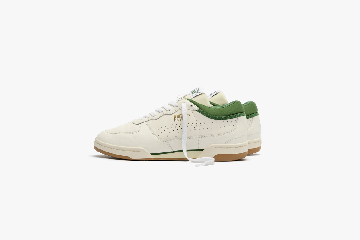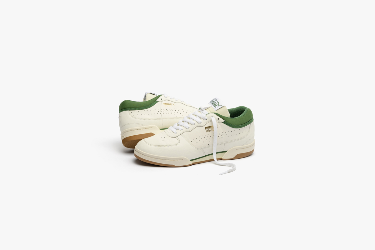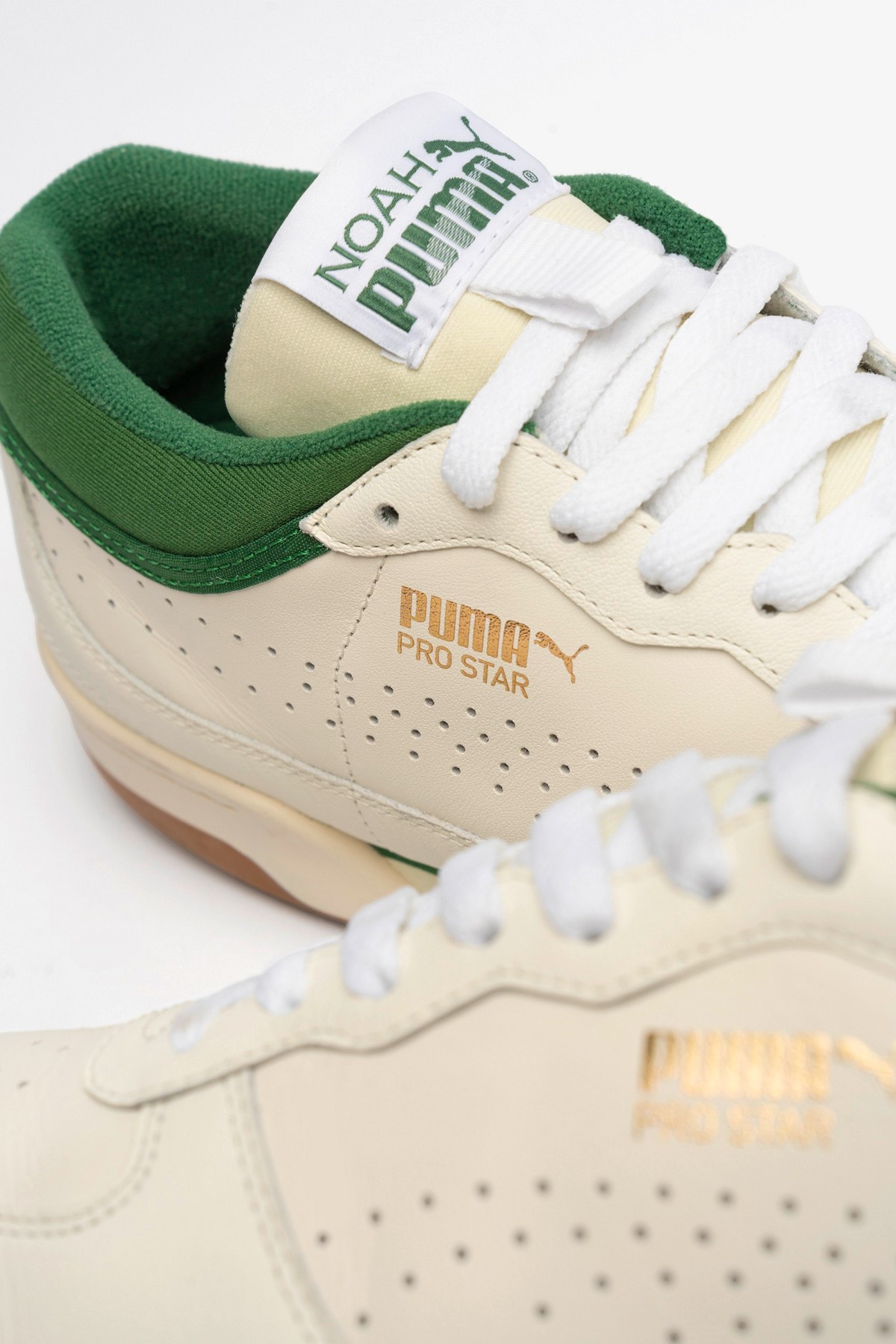 鞋款上选择了 PUMA Pro Star 为蓝本创作,奶白色的鞋身辅以绿色点缀,再搭配上卡其色橡胶外底,直接将复古质感稳稳拿捏,搭配起来更是毫无难度。