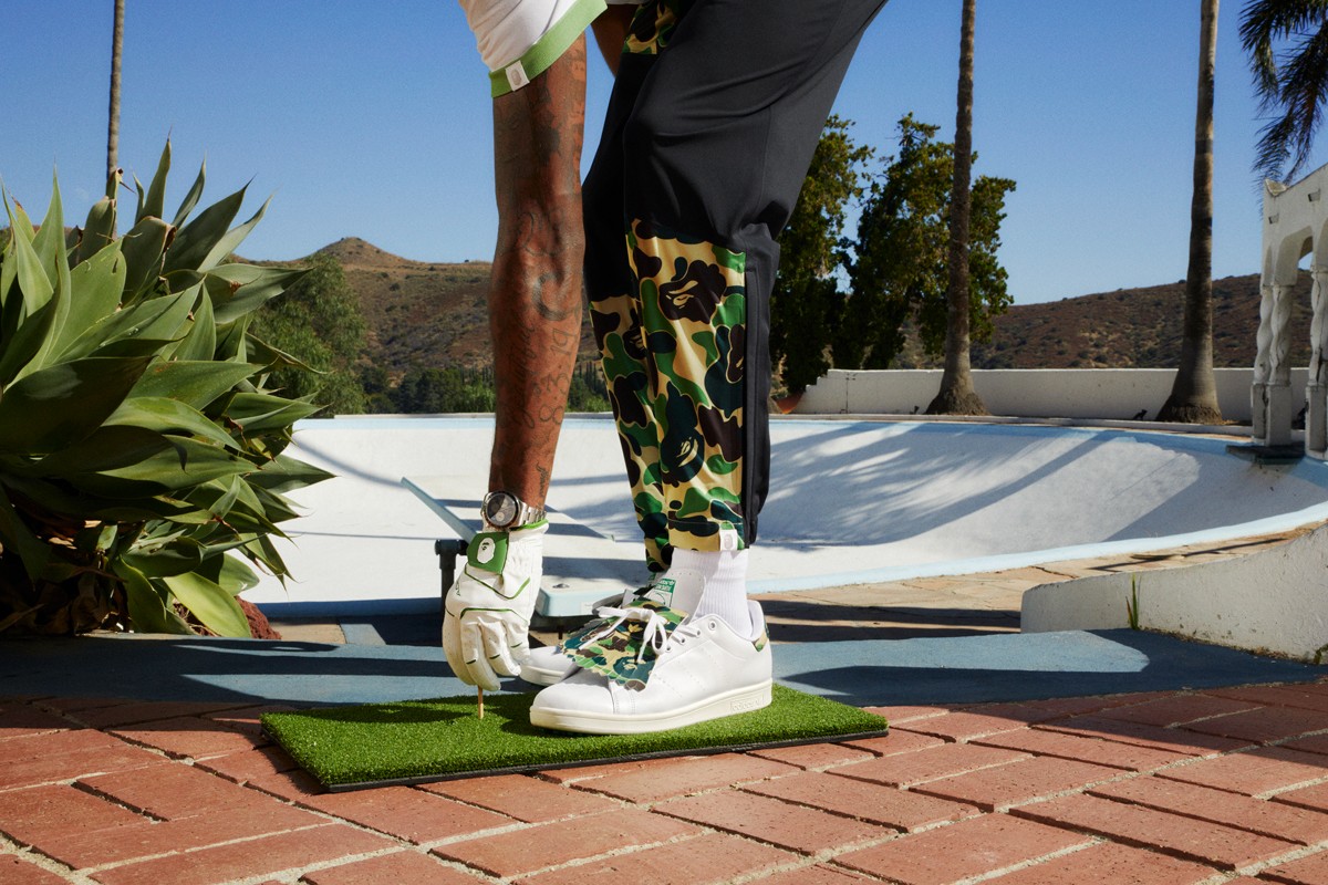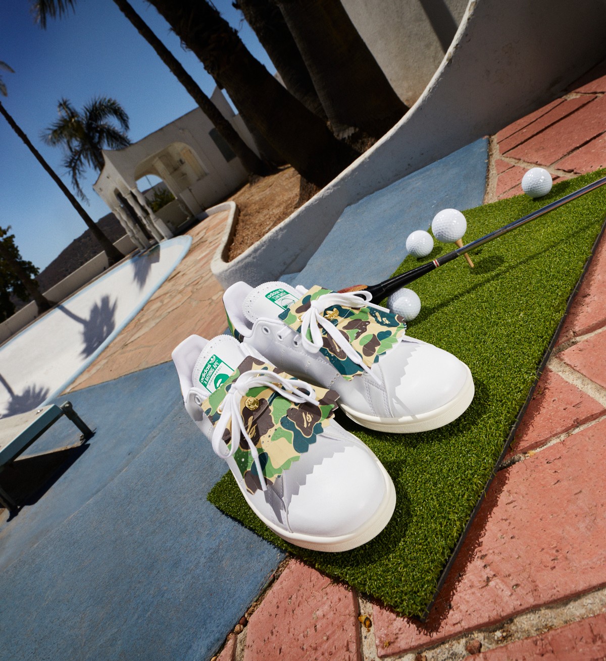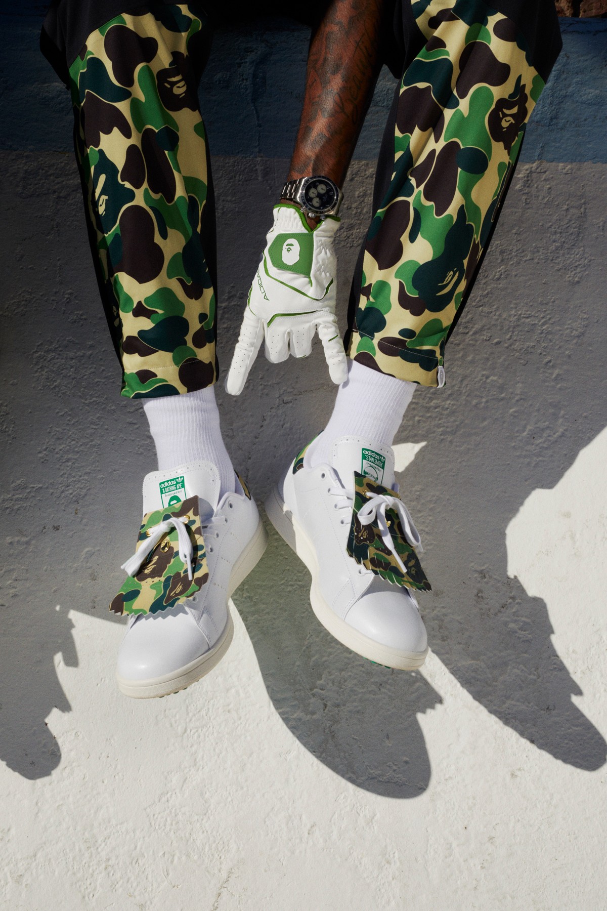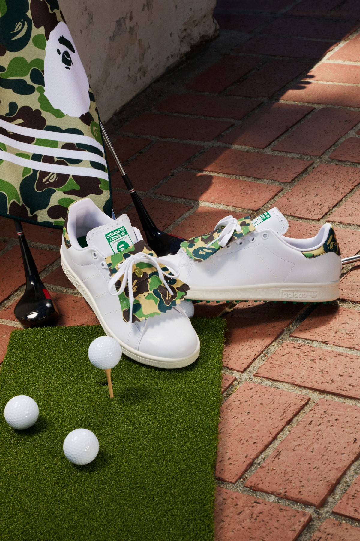 此次联名分别包含有防风夹克、POLO衫、长裤、高尔夫手套、帽子以及毛巾等丰富单品,但当中最抢眼的必须还是当属 BAPE® x adidas Originals Stan Smith Golf。