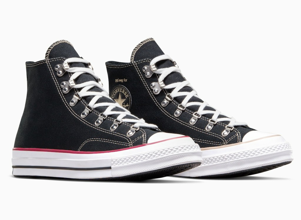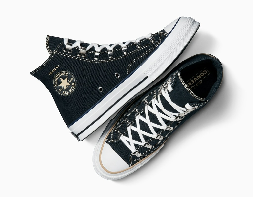联名元素体现在鞋帮处,pgLang Logo 和匡威经典标志放在一起。