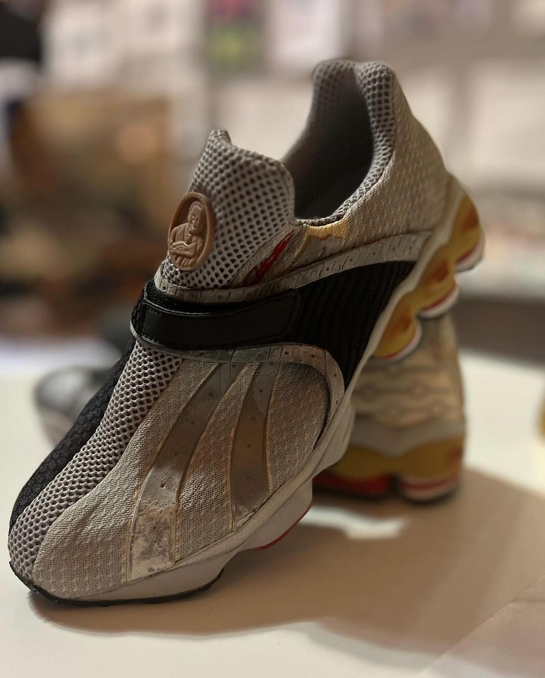 另一双则明显饱受岁月的洗礼,是无鞋带的魔术贴系带方式。