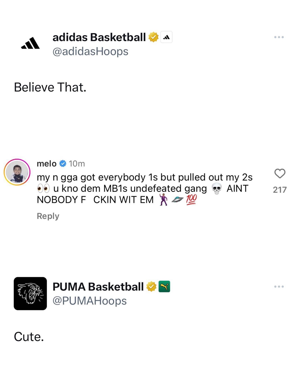 直接回怼 adidas 官方,并说到:“这家伙其他鞋拿的都是一代,只有我的鞋拿的是二代!这说明老子的 MB.01 是无与伦比的,没人能碰瓷这双鞋!”