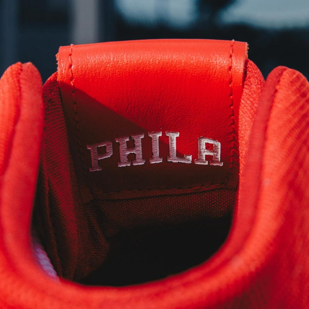 细节方面,除了后跟的 17 号刺绣,鞋舌内侧也印着 PHILA 的字样,代表费城。